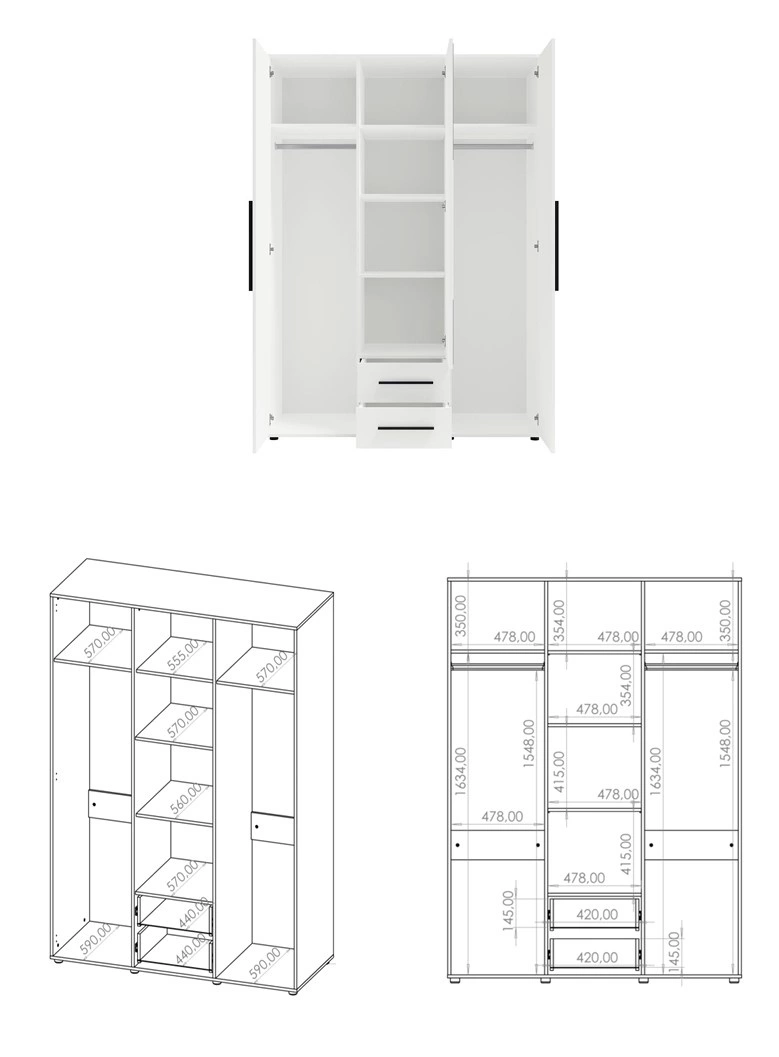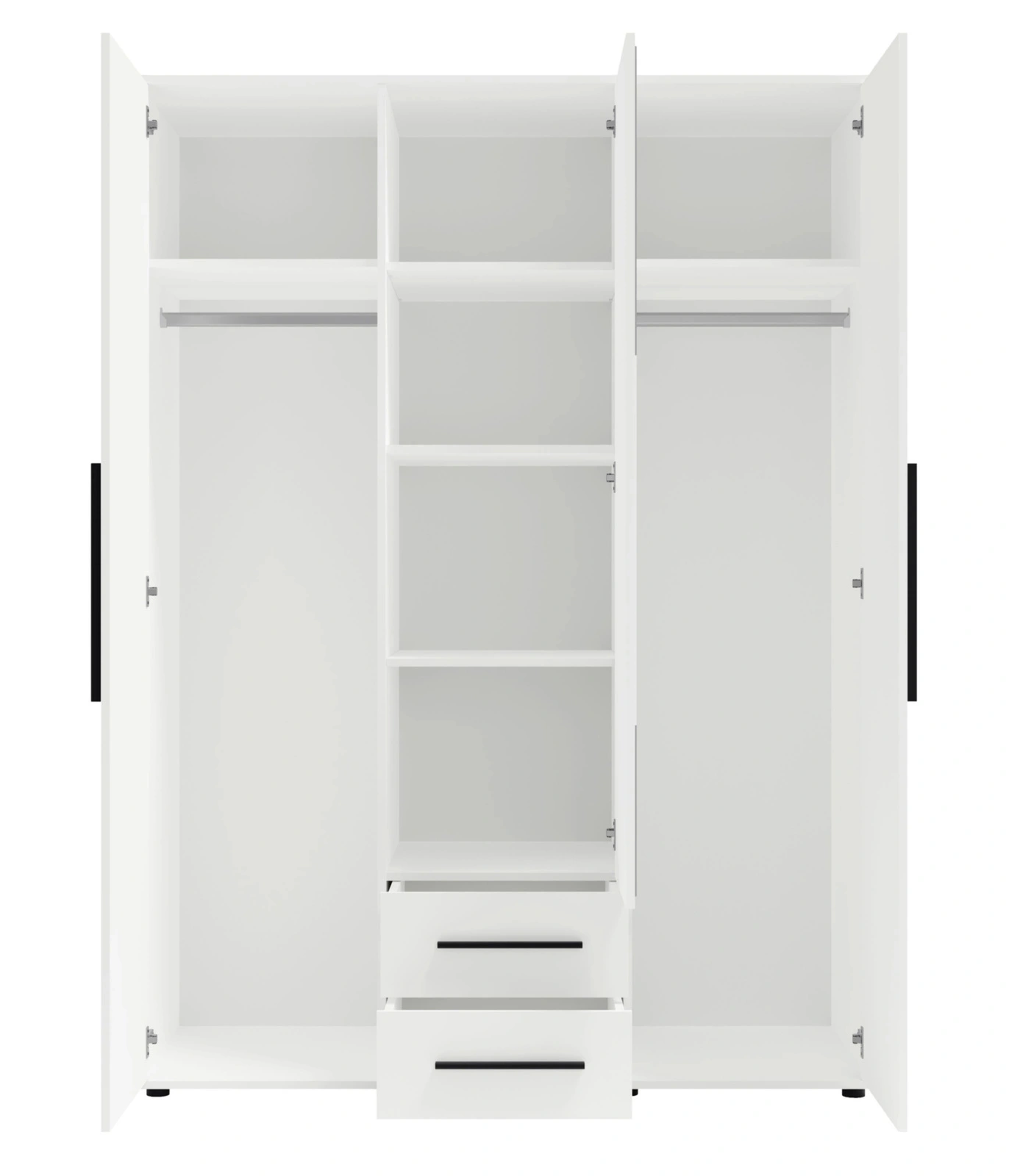 Wnętrze szafy zostało zaprojektowane z myślą o maksymalnej wygodzie przechowywania. Znajdziesz tu dwa drążki na wieszaki umieszczone po bokach, liczne półki w środkowej części oraz dwie praktyczne szuflady na drobiazgi lub bieliznę. Taki układ pozwala na idealną organizację ubrań, od koszul i sukienek, po złożone swetry, jeansy czy akcesoria. Szafa wyróżnia się solidną konstrukcją i starannym wykonaniem, co gwarantuje jej trwałość na lata.