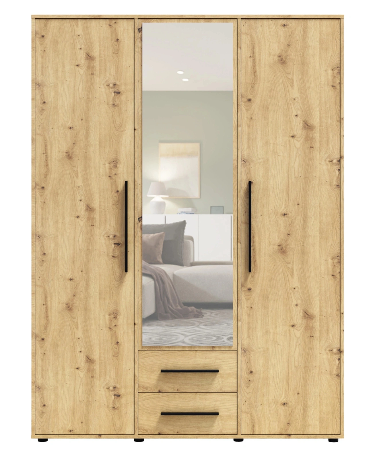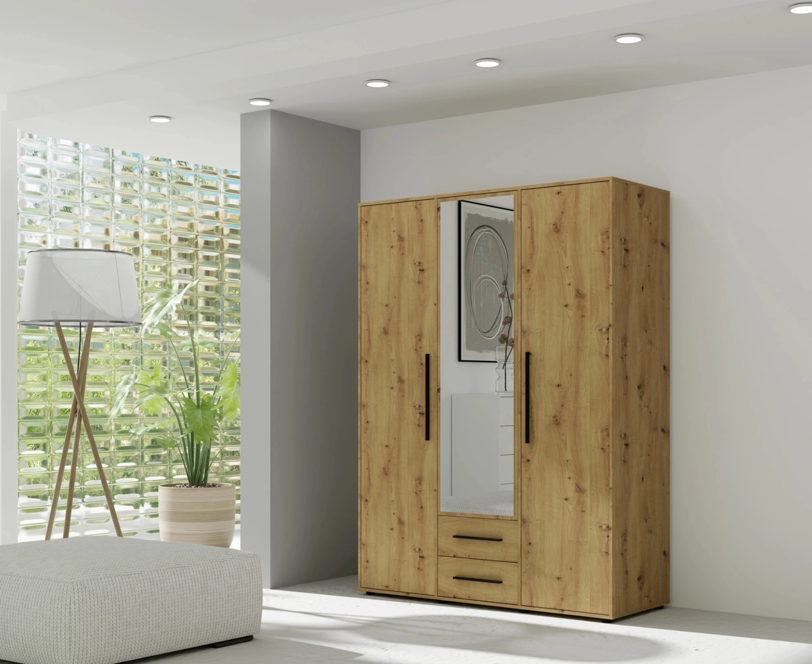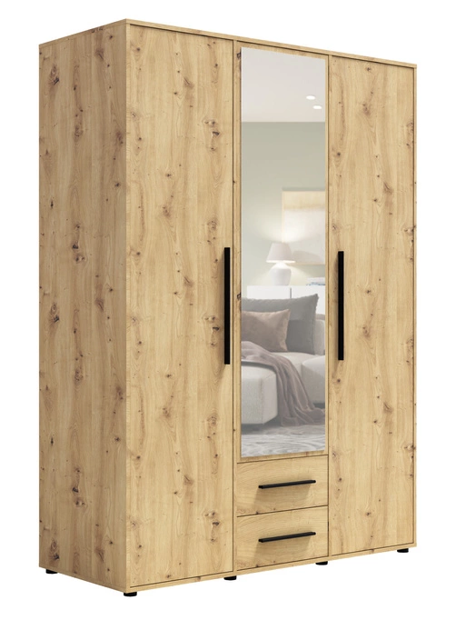 Szafa Modena w dekorze dąb artisan to połączenie nowoczesnej funkcjonalności z ponadczasowym urokiem naturalnego drewna. Jasny odcień dębu artisan wprowadza do wnętrza przytulność, a czarne, minimalistyczne uchwyty podkreślają jej elegancki, loftowy charakter. Centralnie umieszczone lustro optycznie powiększa przestrzeń i zwiększa komfort codziennego użytkowania.