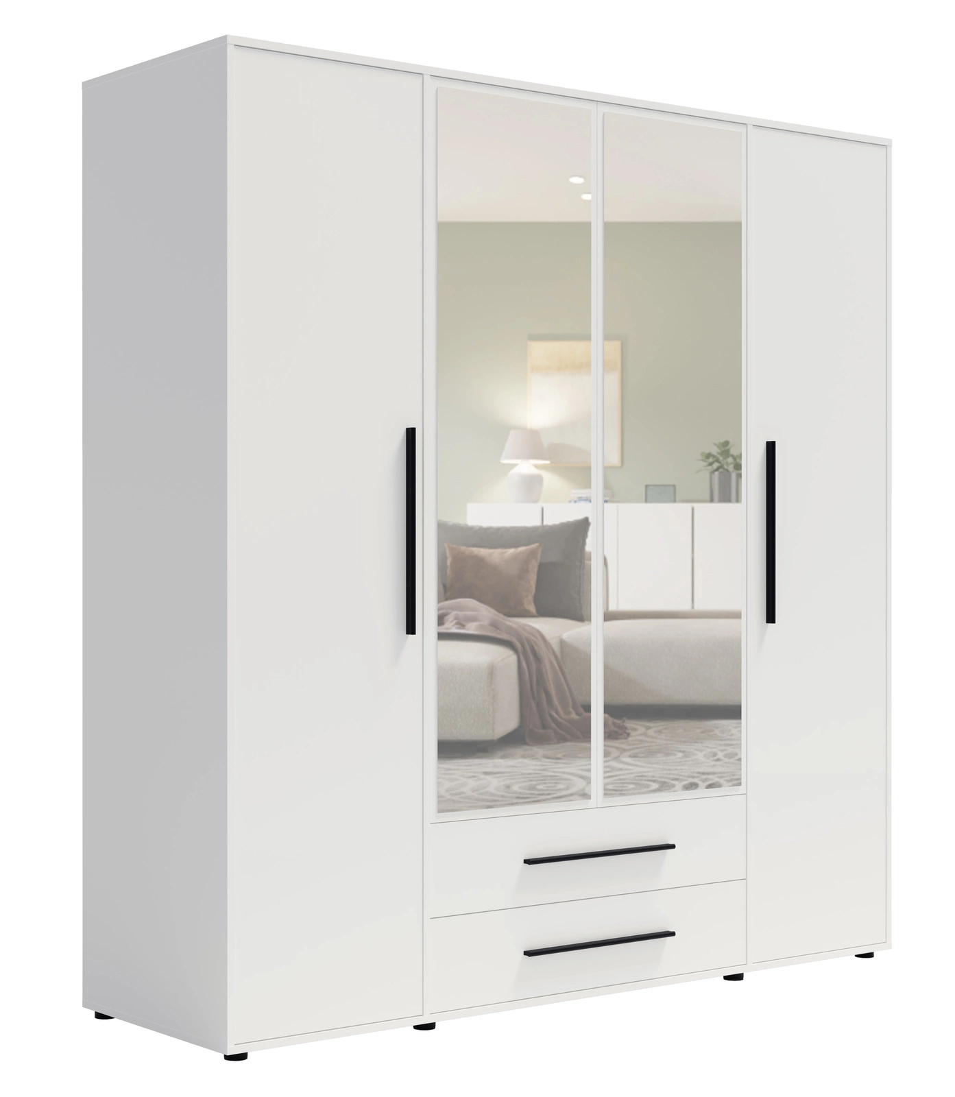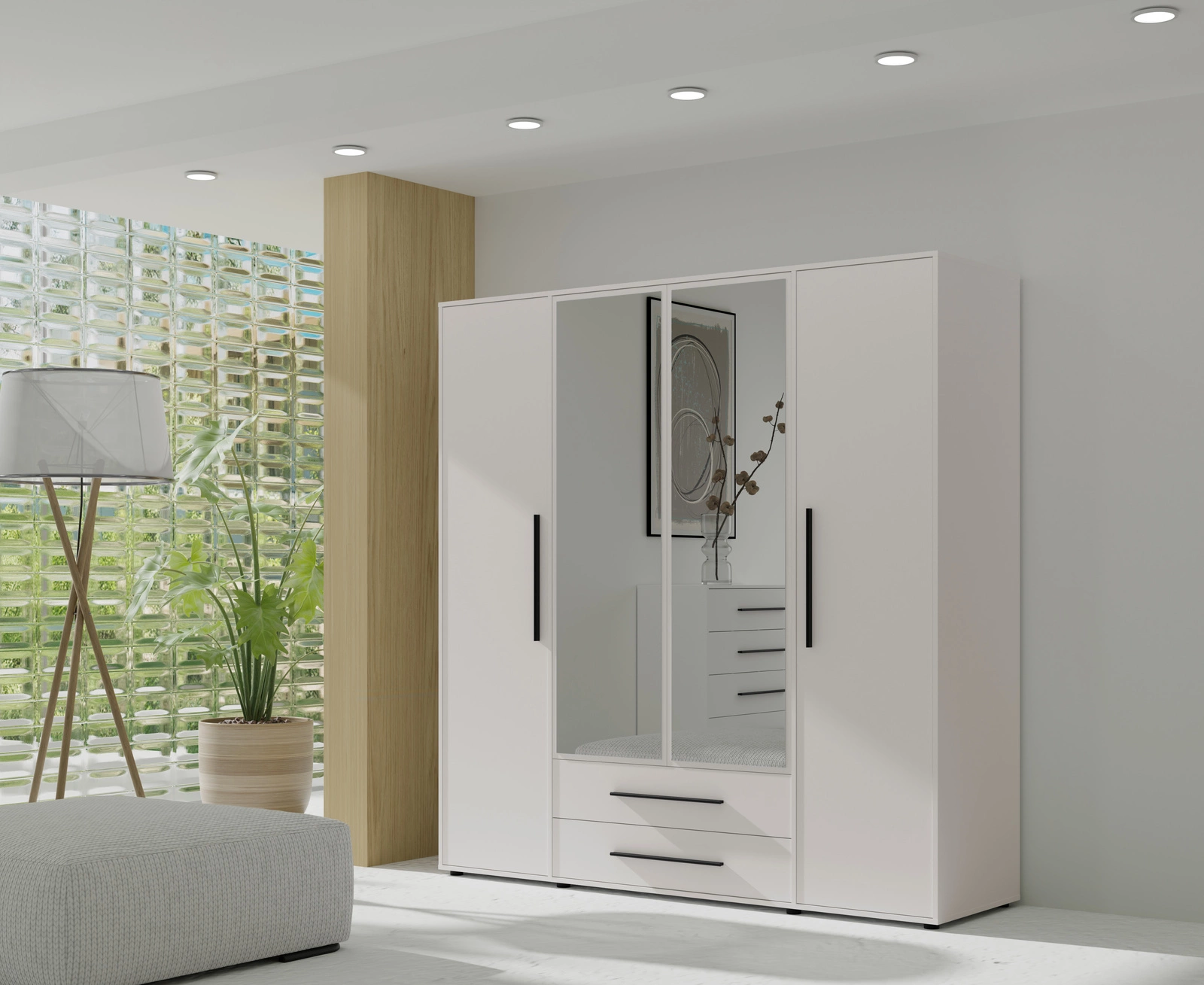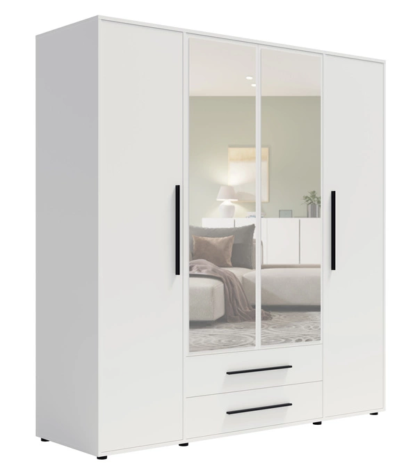 • Szafa Modena biały z lustrem, 4 drzwiami, 2 szufladami, półkami i drążkami. Praktyczna, pojemna i elegancka – idealna do sypialni lub garderoby.