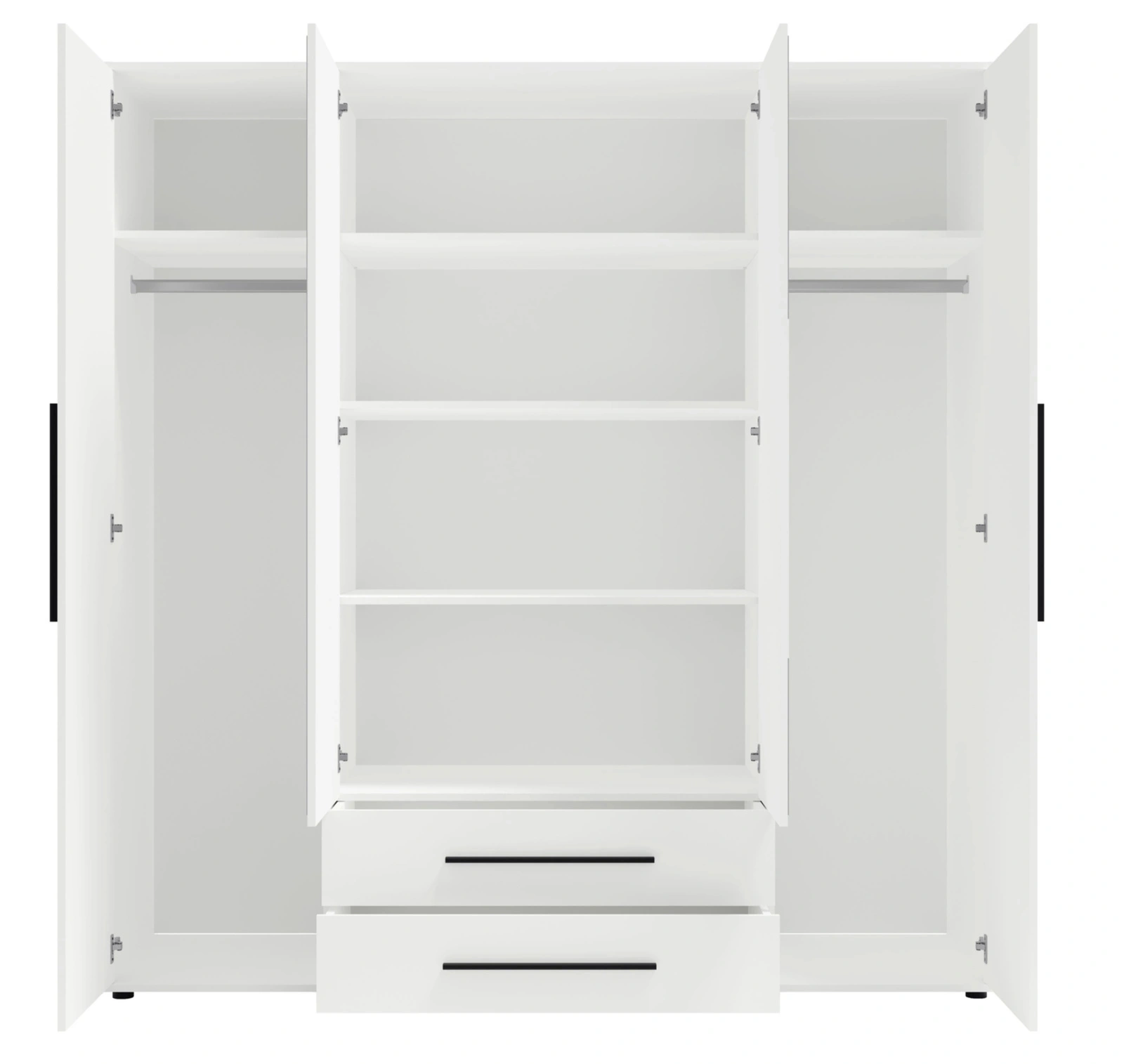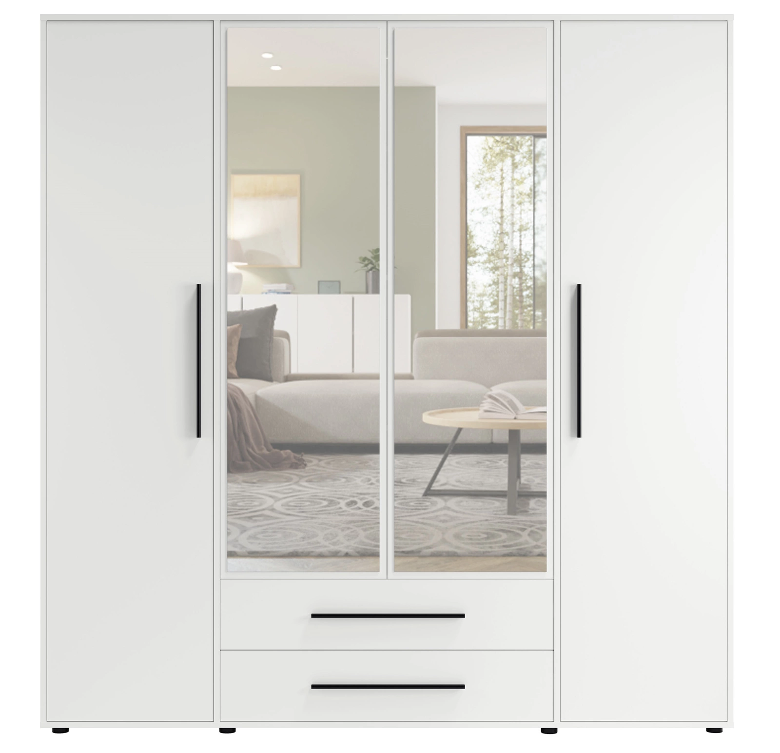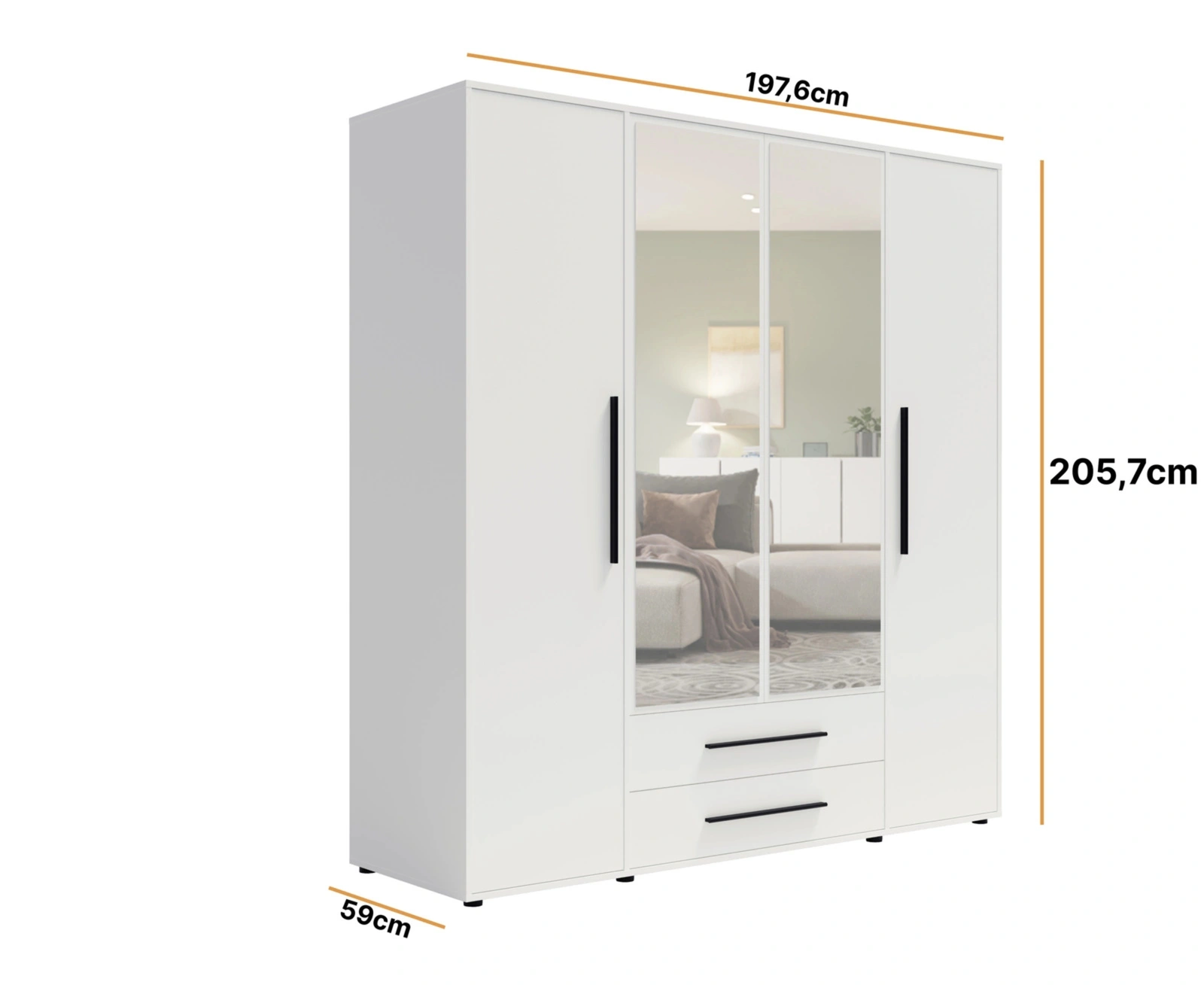 • Szafa Modena biały z lustrem, 4 drzwiami, 2 szufladami, półkami i drążkami. Praktyczna, pojemna i elegancka – idealna do sypialni lub garderoby.
