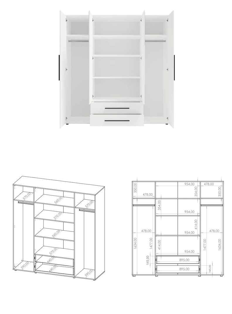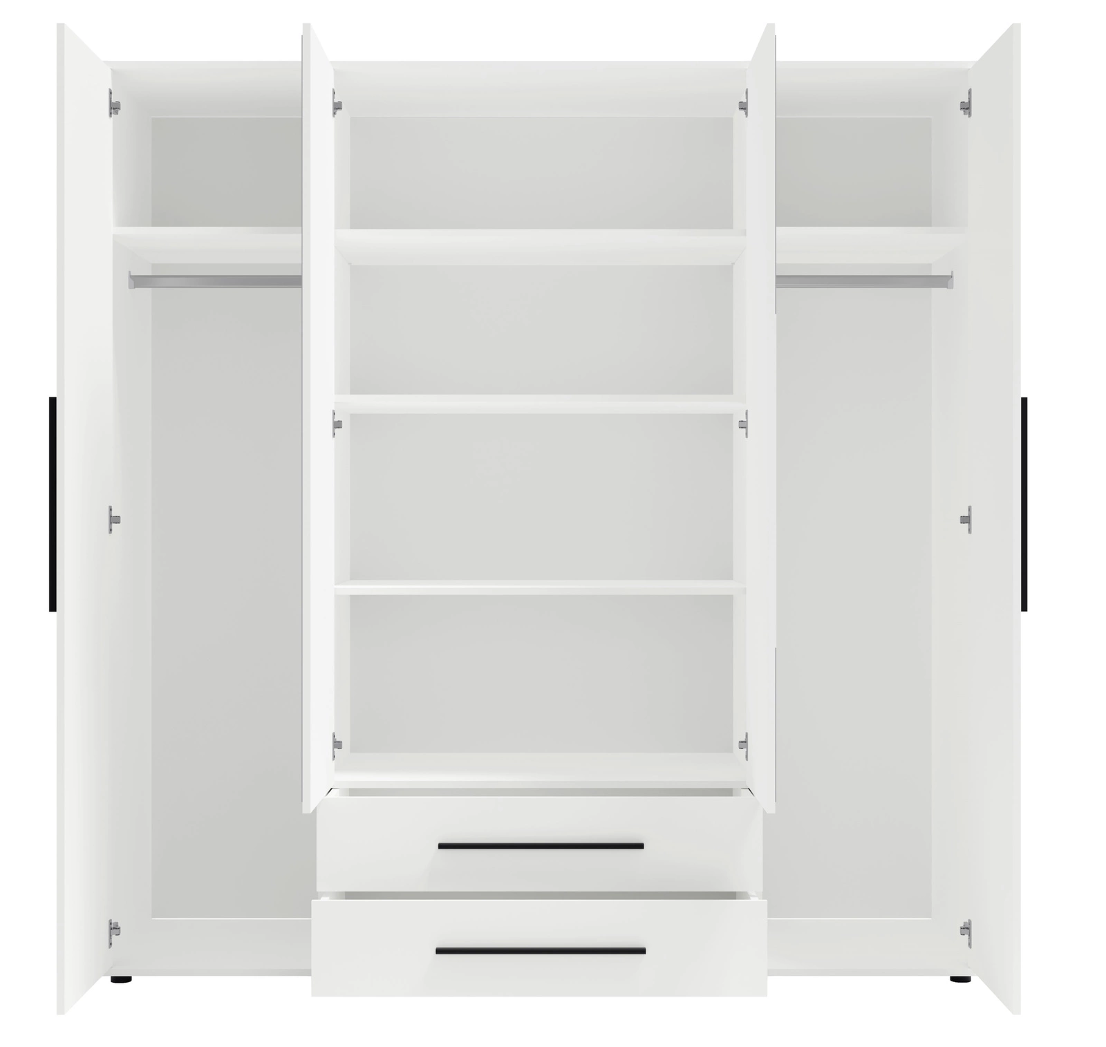 - Szafa Modena kolor czarny z lustrem, 4 drzwiami, 2 szufladami, półkami i drążkami. Praktyczna, pojemna i elegancka – idealna do sypialni lub garderoby.