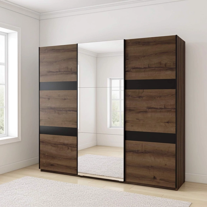 - Pojemna szafa przesuwna z lustrem w kolorze Dąb Monastery / Czarny Połysk szerokość 250 cm – idealna do nowoczesnych wnętrz, stworzy wygodną przestrzeń do codziennego użytku.