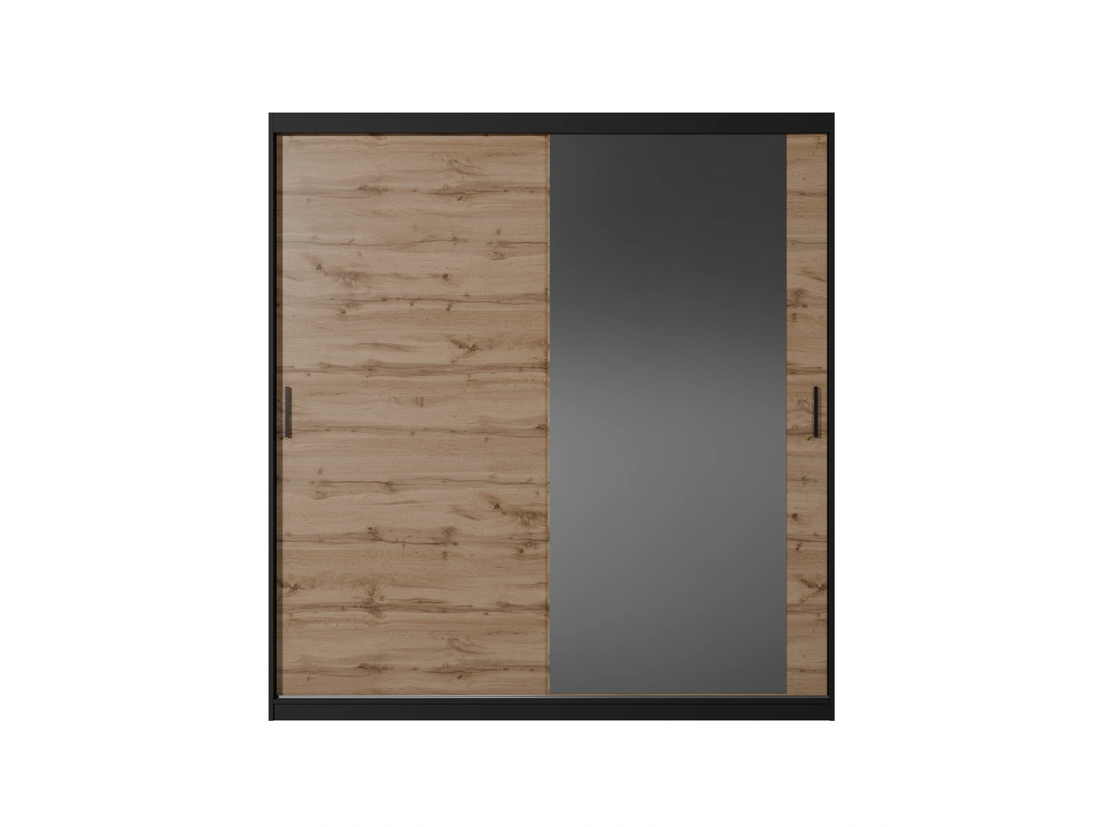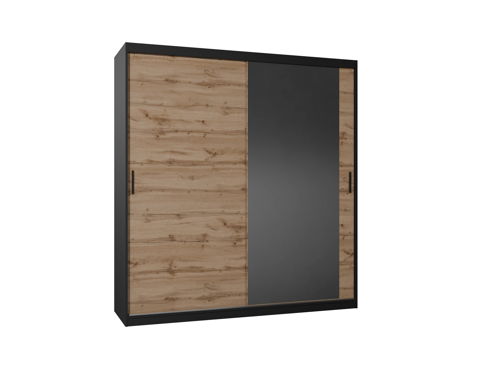 • Duża szafa przesuwna MIRANO (200x215 cm) w kolorze Dąb Wotan to idealny wybór do wnętrz loftowych. Szerokość 200 cm zapewnia ogromną pojemność. Wyrazisty rysunek drewna i czarne akcenty dodają charakteru. Solidna i pakowna.
