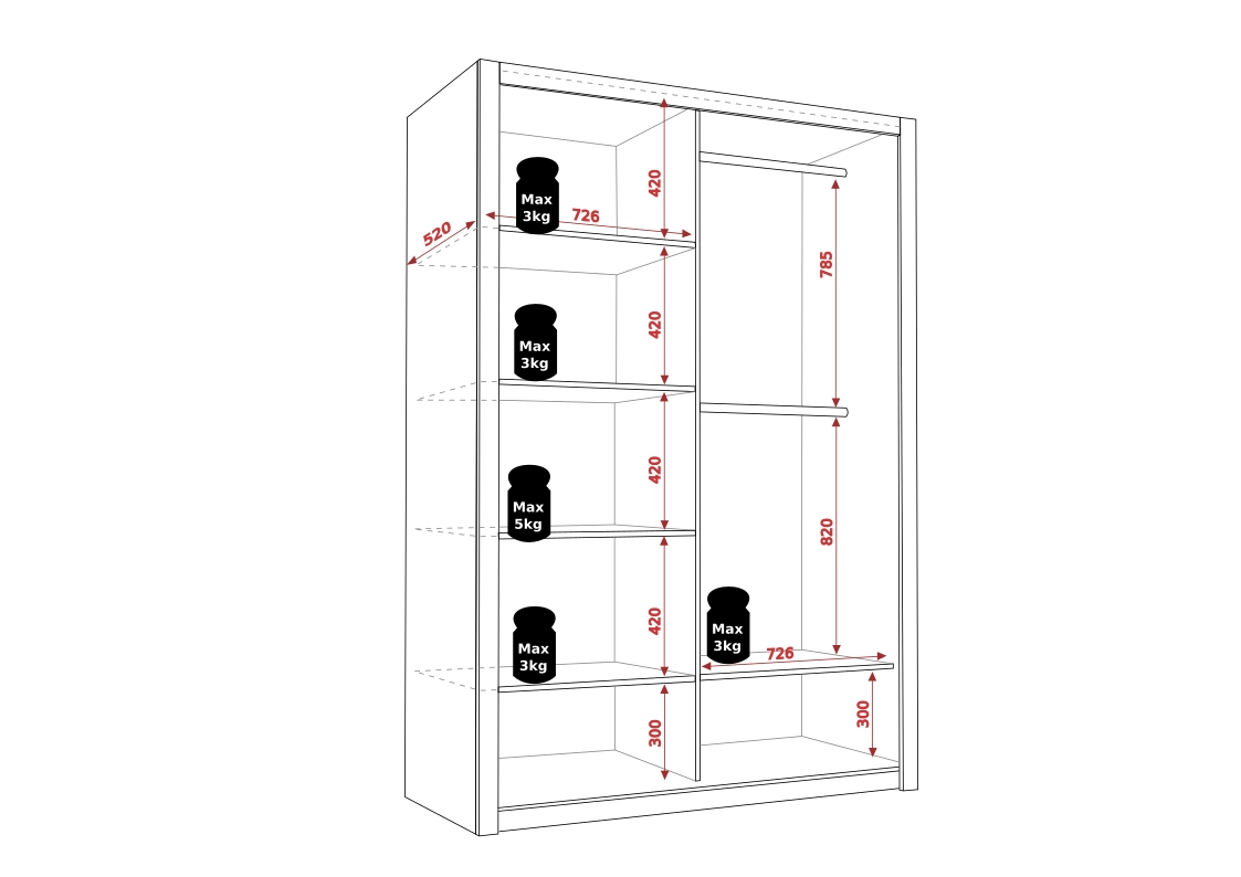 - Szafa przesuwna Tamiza SZ150 idealnie sprawdzi się w domowej sypialni. Zapewnia sporo miejsca do przechowywania ubrań oraz akcesoriów. W środku szafy znajduje się szereg półek oraz dwa drążki ubraniowe.