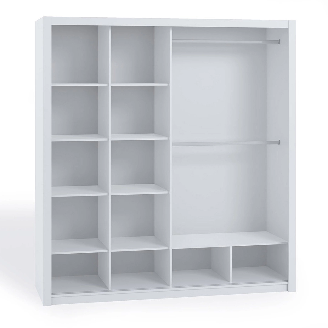• Szafa przesuwna Tamiza SZ220 idealnie sprawdzi się w domowej sypialni. Zapewnia sporo miejsca do przechowywania ubrań oraz akcesoriów. W środku szafy znajdują się dwa szeregi półek oraz jeden, gdzie zamocowano dwa drążki ubraniowe.