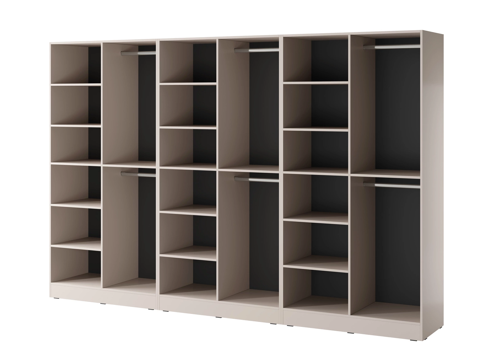 Wnętrze to aż 18 półek i 6 niezależnych drążków – idealna konfiguracja dla dużych potrzeb, bez konieczności kompromisów. Modułowość pozwala na dalszą rozbudowę lub przegrupowanie w zależności od układu wnętrza.