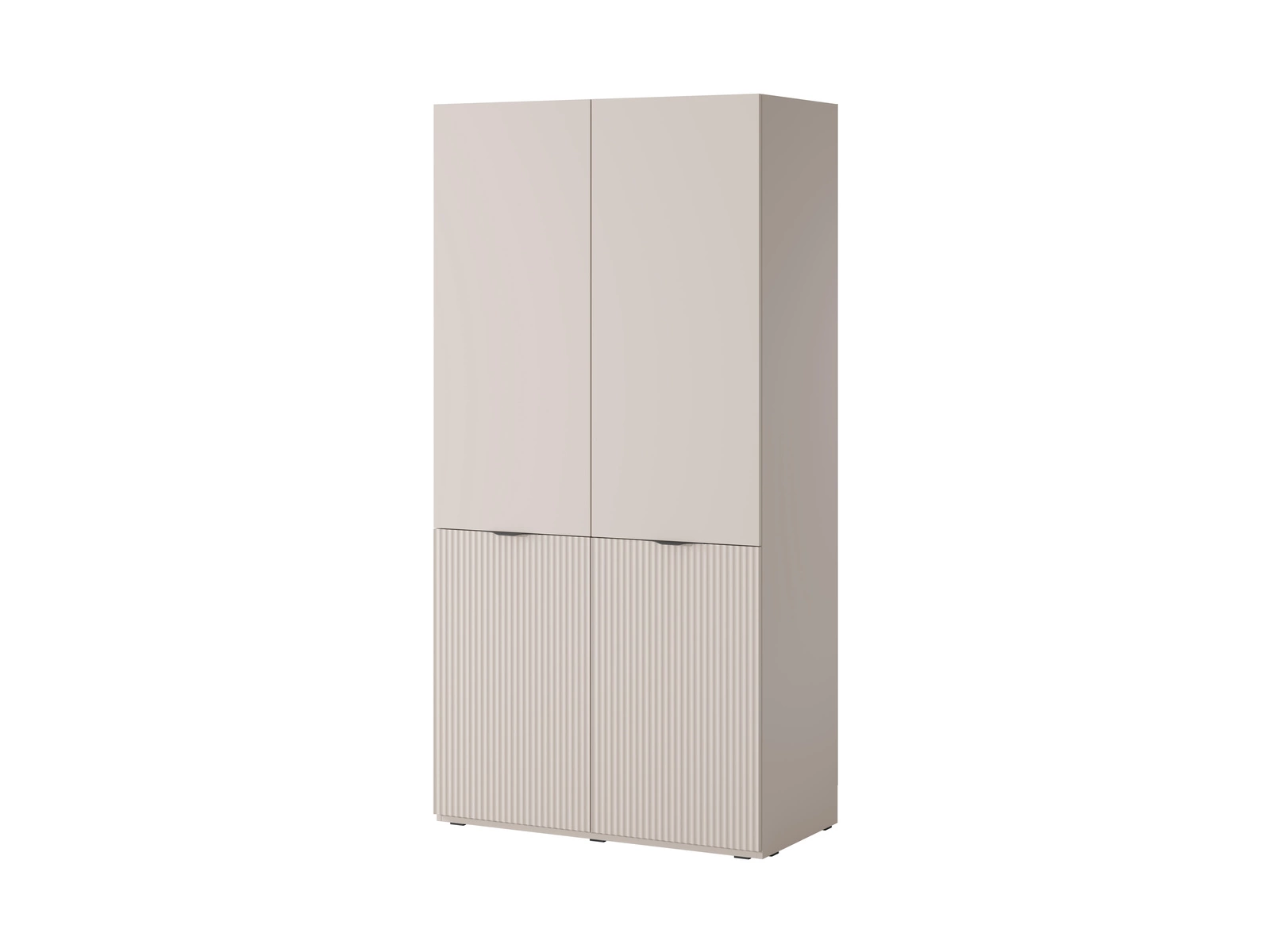 Szafa modułowa 3x101 cm to imponująca, nowoczesna zabudowa, która łączy walory estetyczne z ogromną pojemnością. Skrajne moduły z matowymi, frezowanymi frontami w kolorze kaszmiru zapewniają strefy do przechowywania mniej reprezentacyjnych rzeczy. Centralna część ze szklanym frontem – z charakterystycznym, pionowym ryflowaniem – pozwala subtelnie wyeksponować garderobę lub dodatki.