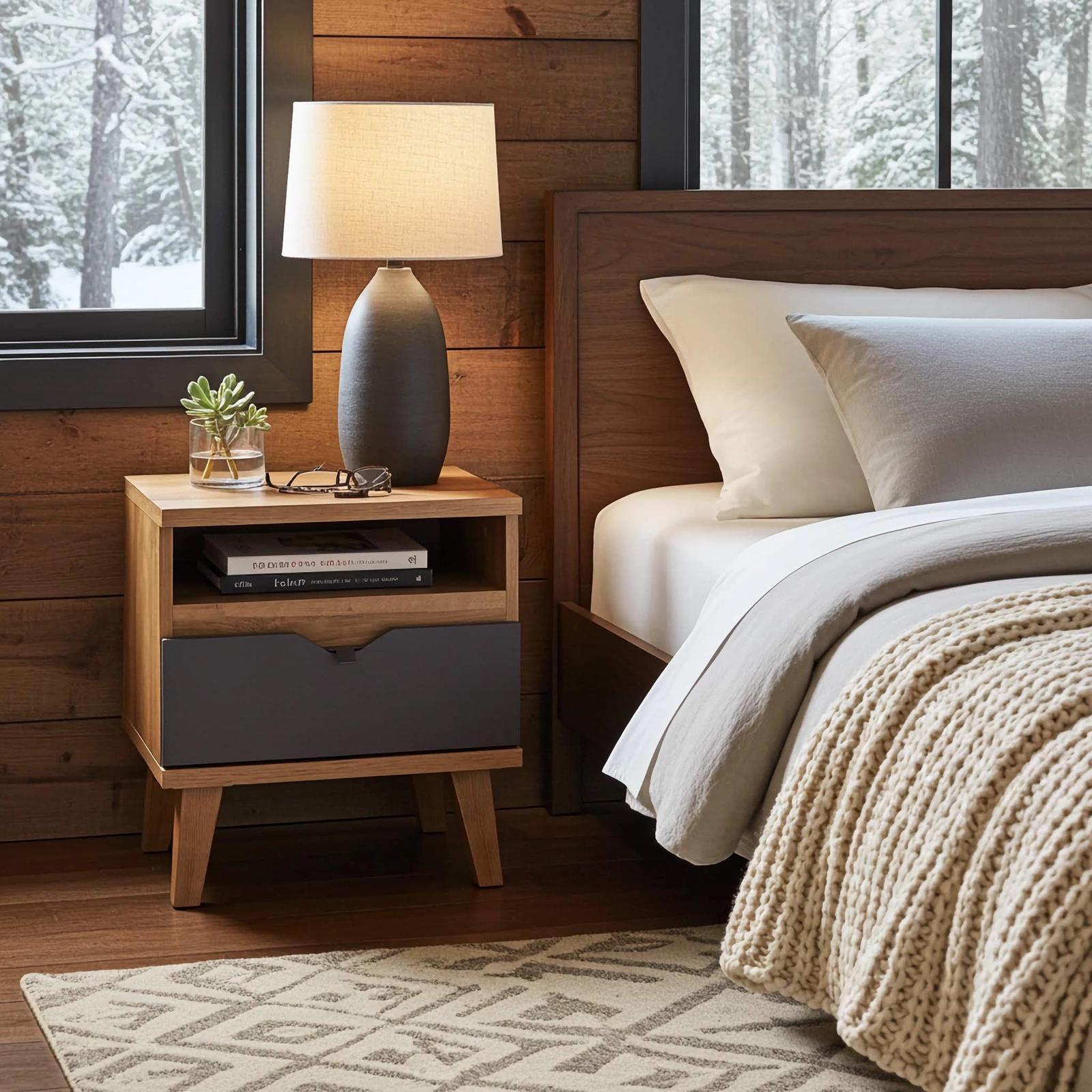 - Kompaktowa szafka nocna z szufladą w kolorze Dąb Złoty / Grafit szerokość 45 cm – idealna do przedpokoju lub salonu, doda stylu i funkcjonalności Twojemu wnętrzu.