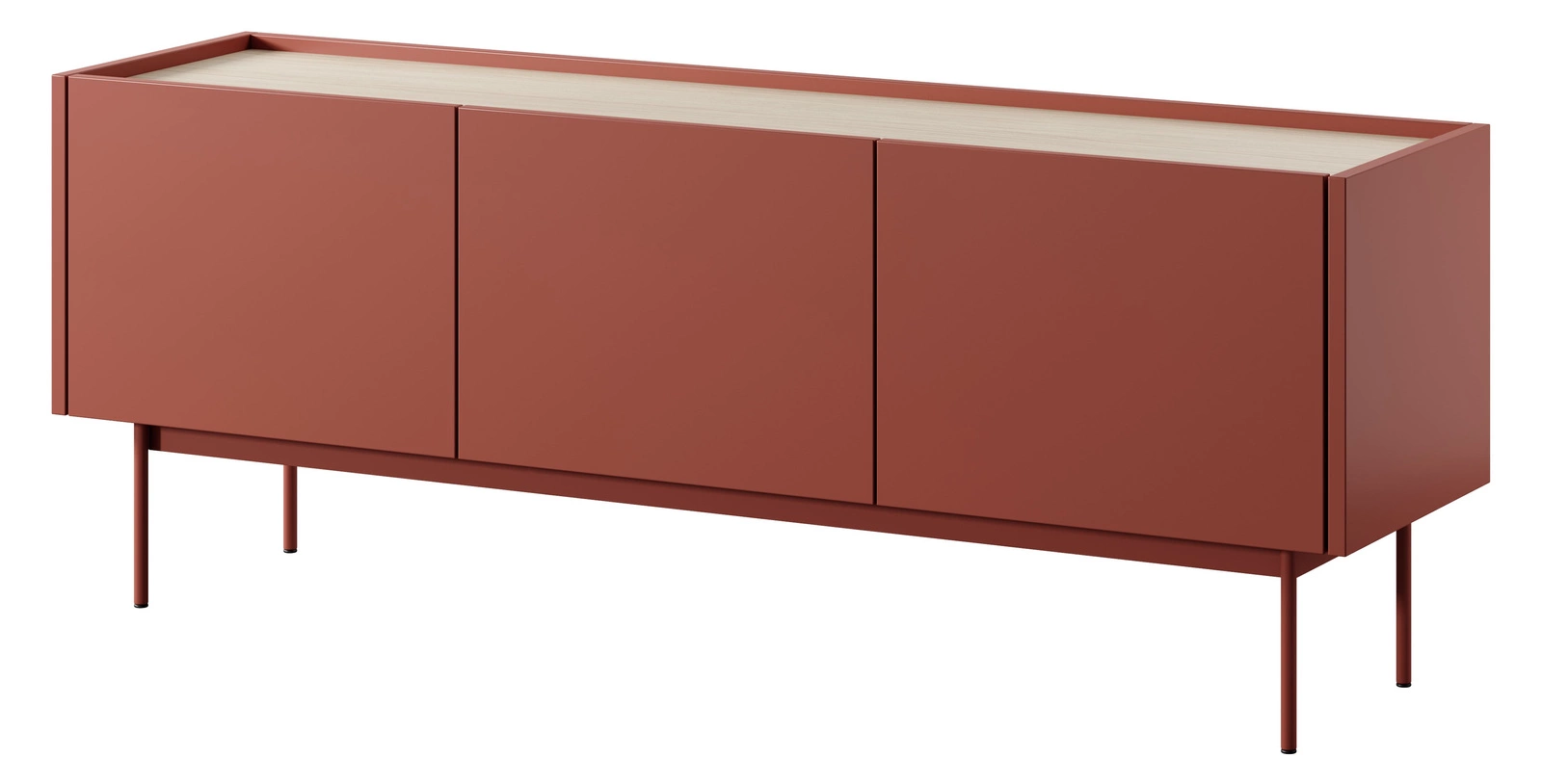 - Nowoczesna szafka RTV w kolorze ceramic red z dębowym wnętrzem. Minimalistyczna forma, trzy fronty bez uchwytów i smukłe nóżki. Stylowy i funkcjonalny wybór do salonu.