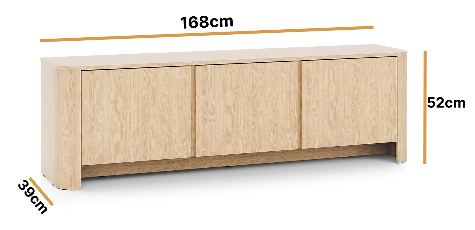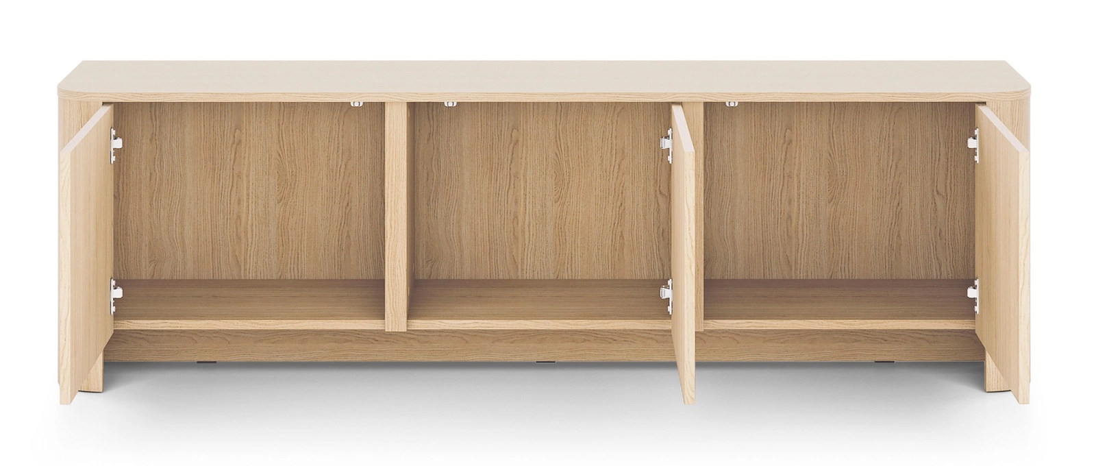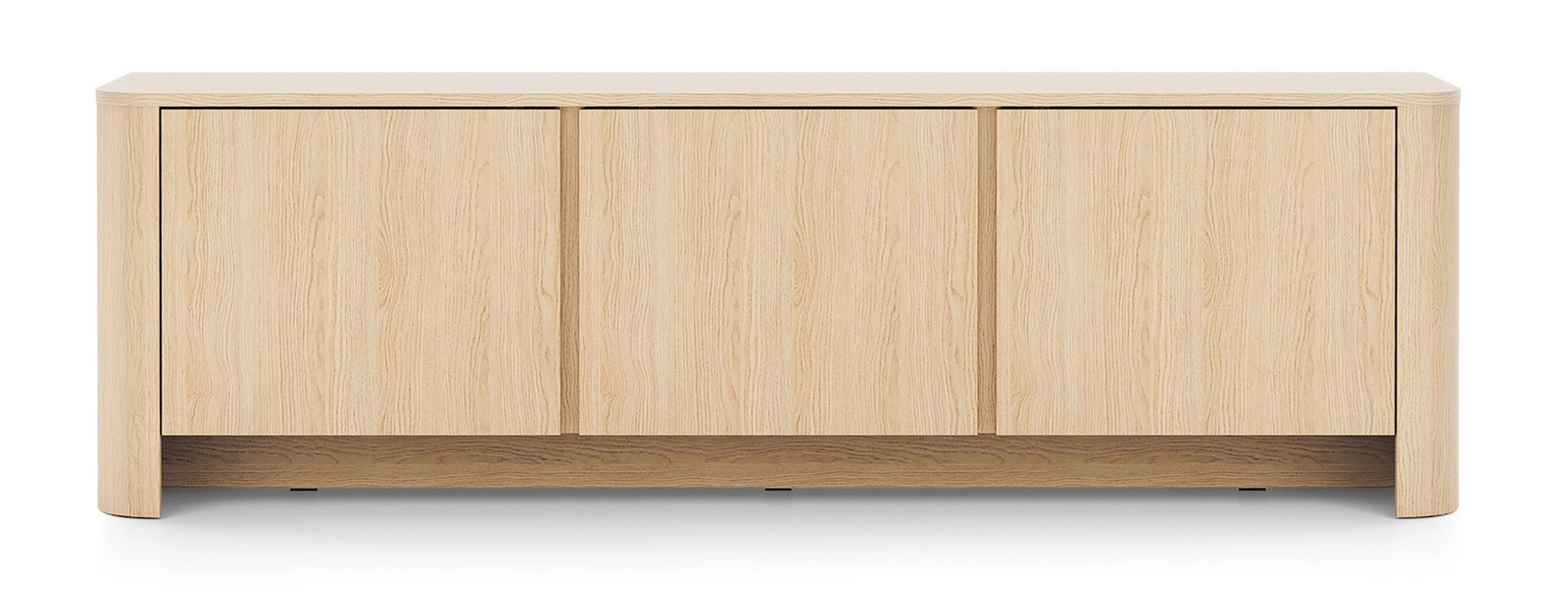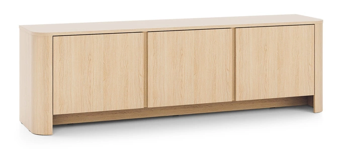 Naturalny rysunek drewna oraz delikatnie zaokrąglone boki sprawiają, że mebel prezentuje się lekko i subtelnie. Za trzema drzwiami ukryto praktyczne półki, które pomieszczą sprzęt RTV, dokumenty czy inne akcesoria. Dzięki swojej neutralnej formie i uniwersalnej kolorystyce szafka Aura świetnie sprawdzi się zarówno w nowoczesnych, jak i klasycznych wnętrzach.