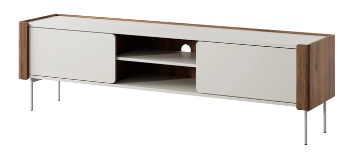 - Szafka RTV 180cm z zaokrąglonymi bokami w dekorze orzecha warmia i kaszmirowymi frontami. Praktyczne półki na sprzęt i dwie zamykane szafki. Idealna do nowoczesnego salonu – stylowa, funkcjonalna i lekka w formie.