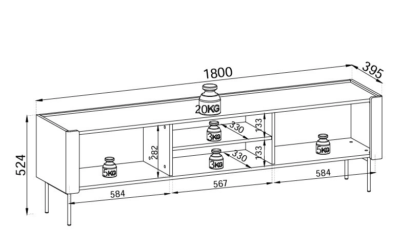 Szafka wyposażona jest w dwie otwarte półki z otworem na przewody – idealne na dekoder, konsolę czy inne urządzenia multimedialne – oraz trzy zamykane szafki, które dyskretnie pomieszczą wszystkie drobiazgi. System Push to Open zapewnia wygodę użytkowania, a wysokie metalowe nóżki dodają lekkości całej konstrukcji i ułatwiają sprzątanie pod meblem.