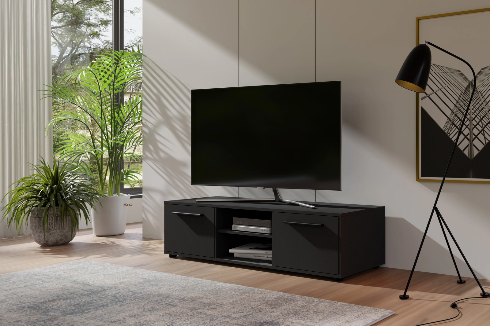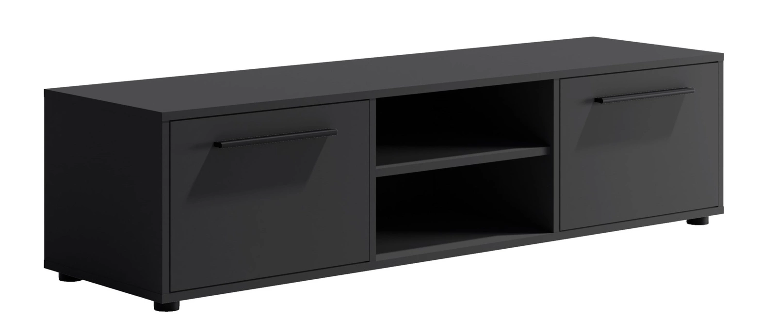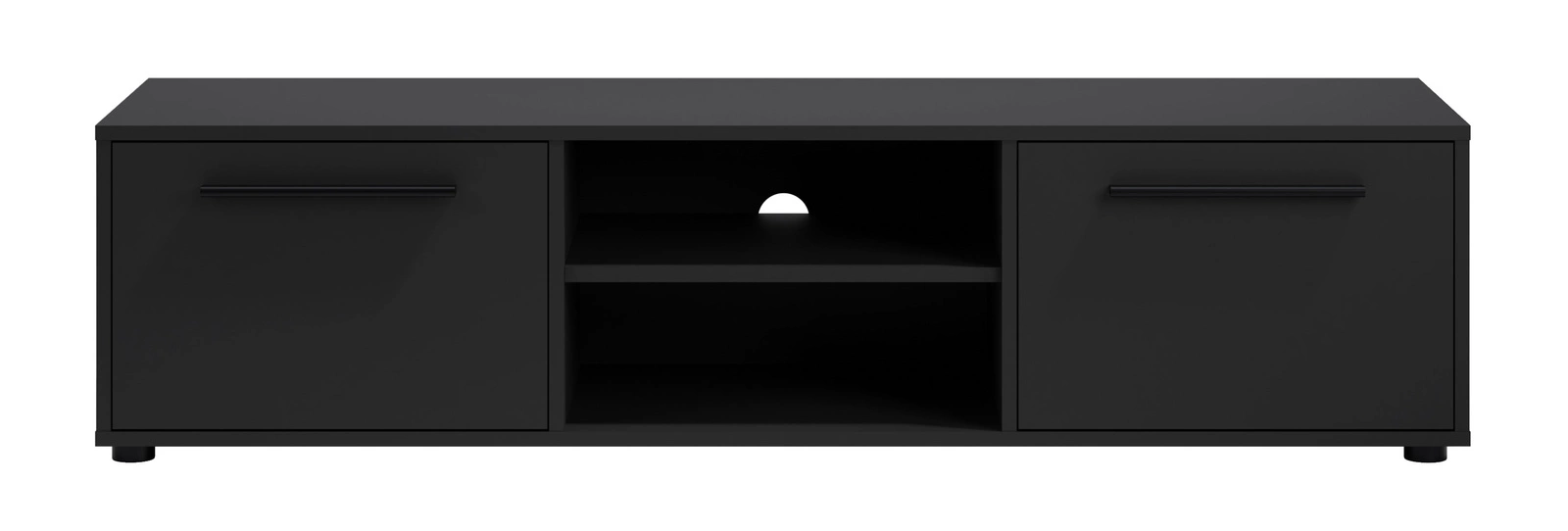 - Szafka RTV Modena 150cm w kolorze czarnym z czarnymi uchwytami. Funkcjonalna, pojemna i elegancka – idealna do nowoczesnego salonu.