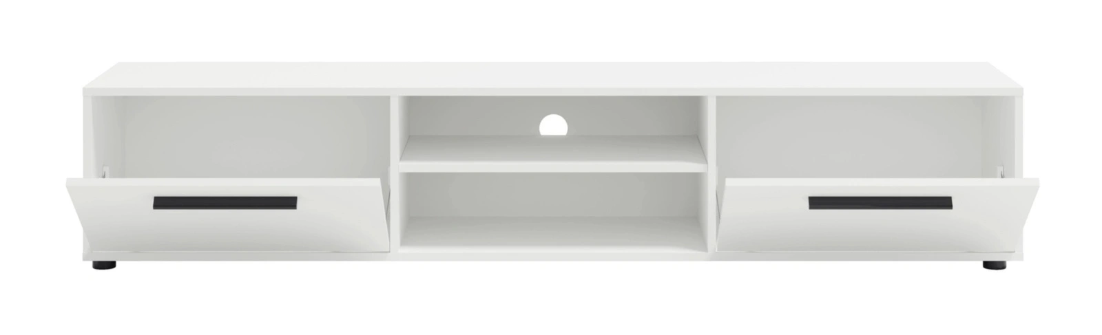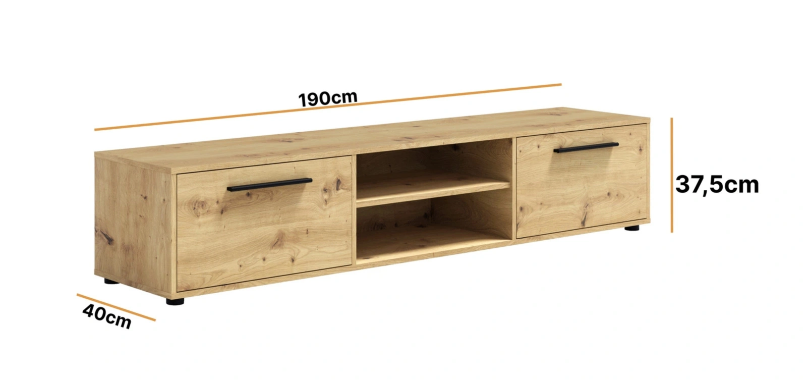 Model wyposażony jest w dwie zamykane szafki boczne oraz otwartą półkę środkową podzieloną na dwa poziomy, co pozwala na wygodne przechowywanie sprzętu RTV, konsol, dekoderów oraz innych akcesoriów. Blat o długości 190 cm bez problemu pomieści telewizor oraz dekoracje, dzięki czemu zyskasz estetyczną i praktyczną przestrzeń w swoim salonie.