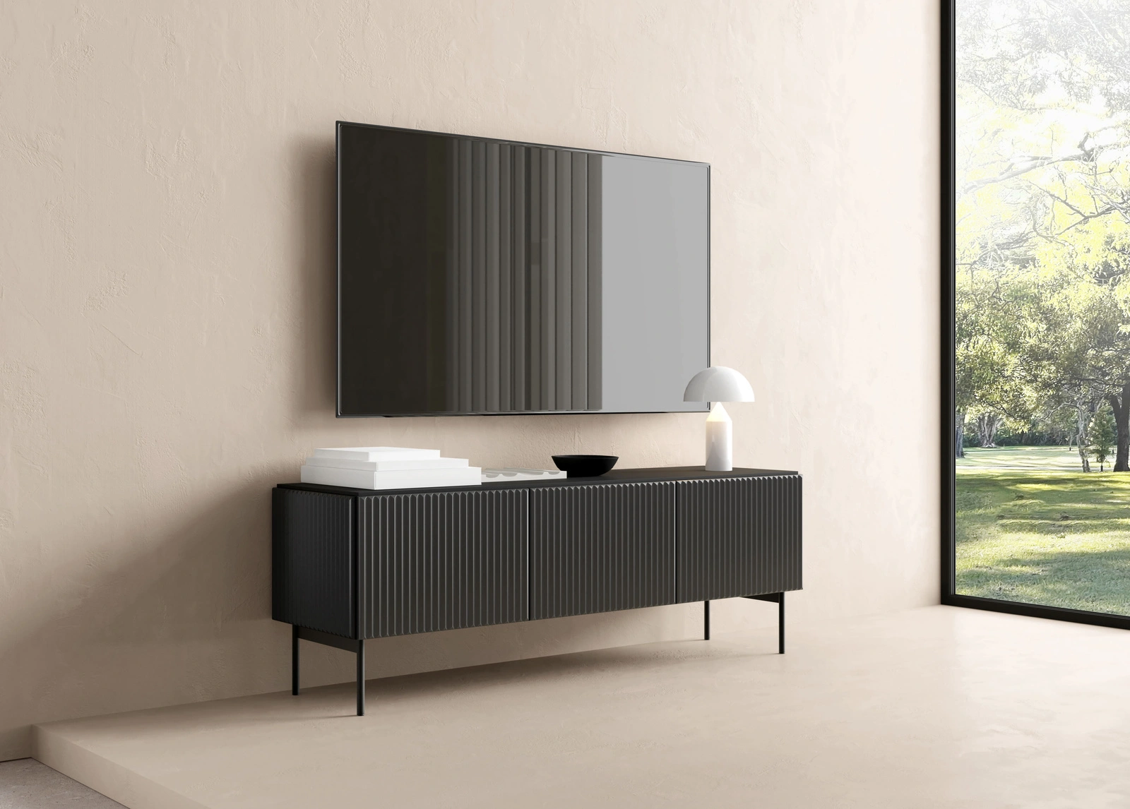 - Kompaktowa szafka RTV MUTI (147 cm) w głębokiej czerni. Posiada 3 drzwi z ryflowanym frontem MDF. System Push-to-Open zapewnia nowoczesny, minimalistyczny wygląd. Idealna do mniejszych salonów w stylu loft. Czarne metalowe nóżki.