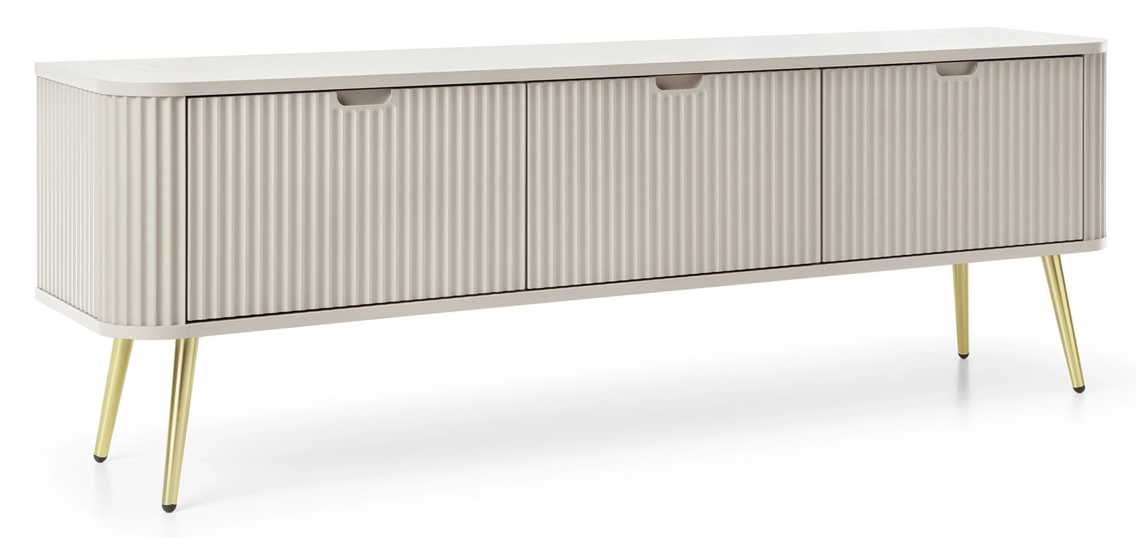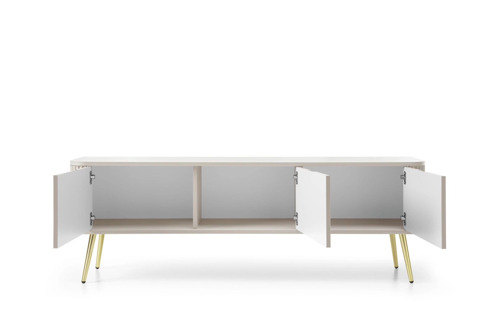 Szafka RTV Porto 168cm w kolorze cashmere trzydrzwiowa z ryflowanymi frontami i złotymi nogami