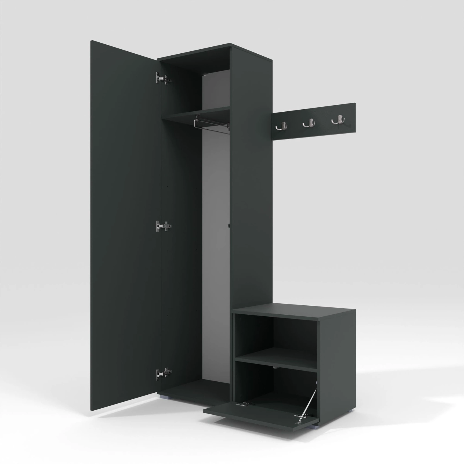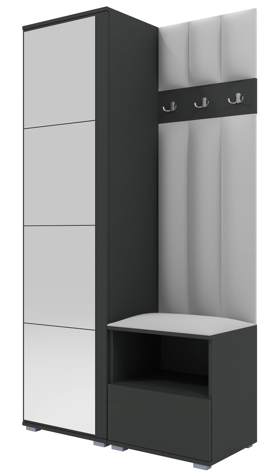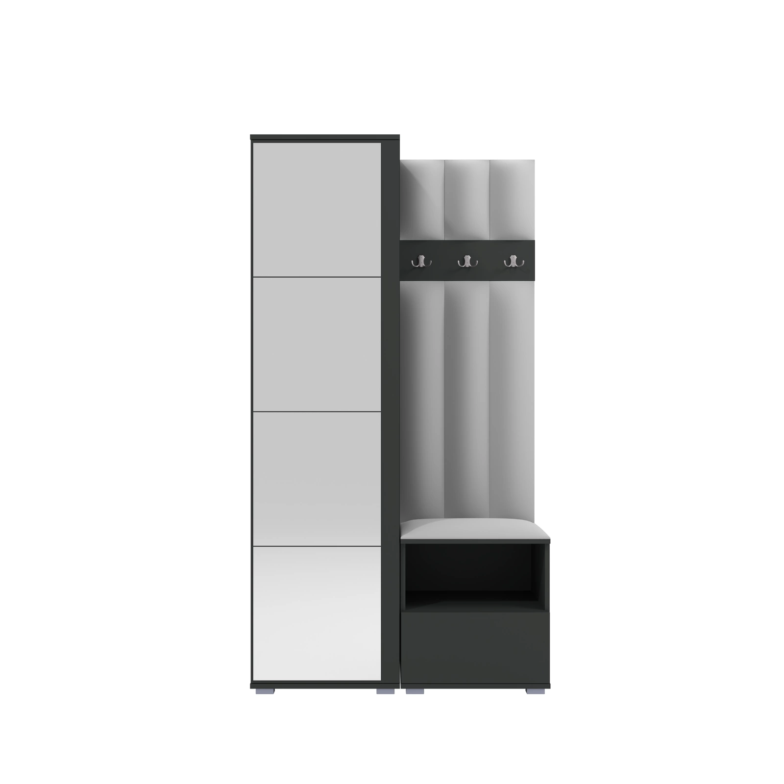 • Stylowa garderoba z panelami tapicerowanymi w kolorze grafitowym. Zawiera wysoką szafkę z lustrem, siedzisko z szafką na buty oraz wieszak z haczykami. Idealny wybór dla tych, którzy cenią sobie elegancję i praktyczność.