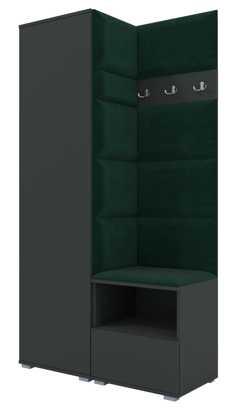 • Stylowa garderoba z panelami tapicerowanymi w kolorze grafit. Zawiera wysoką szafkę z wieszakiem, siedzisko z szafką na buty oraz wieszak z haczykami. Idealny wybór dla tych, którzy cenią sobie elegancję i praktyczność.