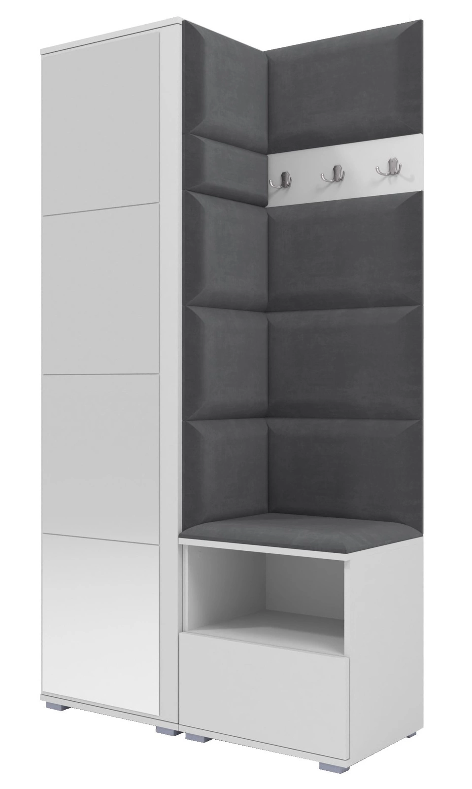 - Stylowa garderoba z panelami tapicerowanymi w kolorze białym. Zawiera wysoką szafkę z lustrem, siedzisko z szafką na buty oraz wieszak z haczykami. Idealny wybór dla tych, którzy cenią sobie elegancję i praktyczność.