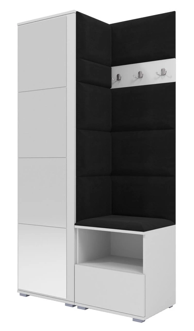 - Stylowa garderoba z panelami tapicerowanymi w kolorze białym. Zawiera wysoką szafkę z lustrem, siedzisko z szafką na buty oraz wieszak z haczykami. Idealny wybór dla tych, którzy cenią sobie elegancję i praktyczność.
