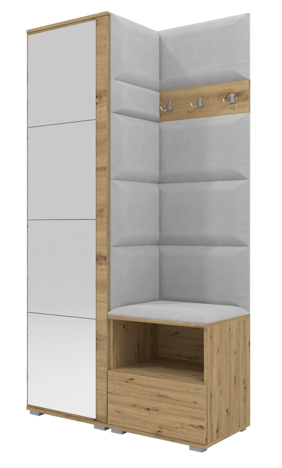 - Stylowa garderoba z panelami tapicerowanymi w kolorze dąb artisan. Zawiera wysoką szafkę z lustrem, siedzisko z szafką na buty oraz wieszak z haczykami. Idealny wybór dla tych, którzy cenią sobie elegancję i praktyczność.