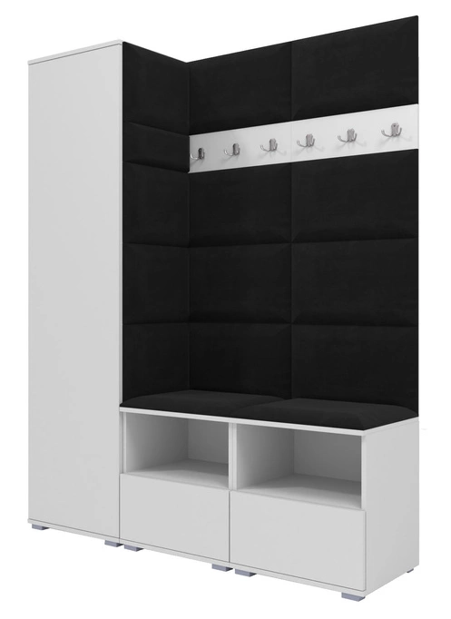 • Stylowa, biała garderoba z panelami tapicerowanymi w kolorze czarnym. Zawiera wysoką szafkę z wieszakiem, podwójne siedzisko z szafką na buty oraz wieszak z haczykami. Idealny wybór dla tych, którzy cenią sobie elegancję i praktyczność.