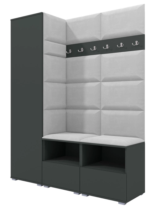 - Stylowa, grafitowa garderoba z panelami tapicerowanymi w jasno szarym kolorze. Zawiera wysoką szafkę z wieszakiem, podwójne siedzisko z szafką na buty oraz wieszak z haczykami. Idealny wybór dla tych, którzy cenią sobie elegancję i praktyczność.