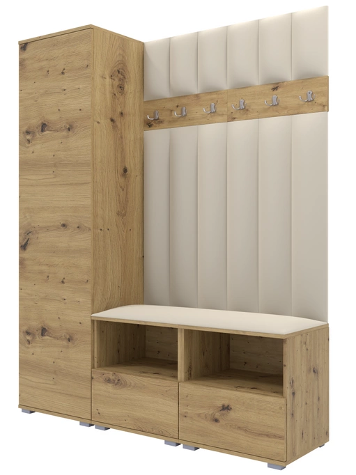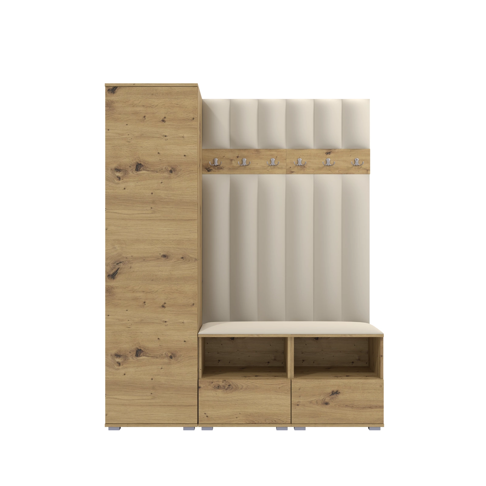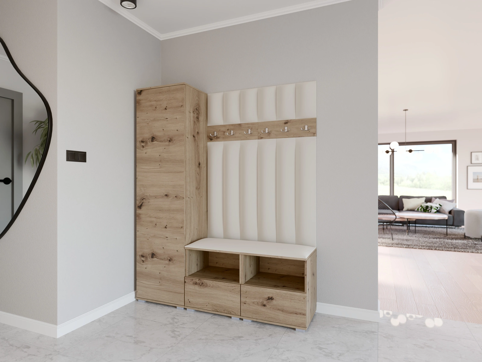 • Stylowa garderoba w kolorze dąb artisan z panelami tapicerowanymi w kolorze kremowym. Zawiera wysoką szafkę z wieszakiem, podwójne siedzisko z szafką na buty oraz wieszak z haczykami. Idealny wybór dla tych, którzy cenią sobie elegancję i praktyczność.