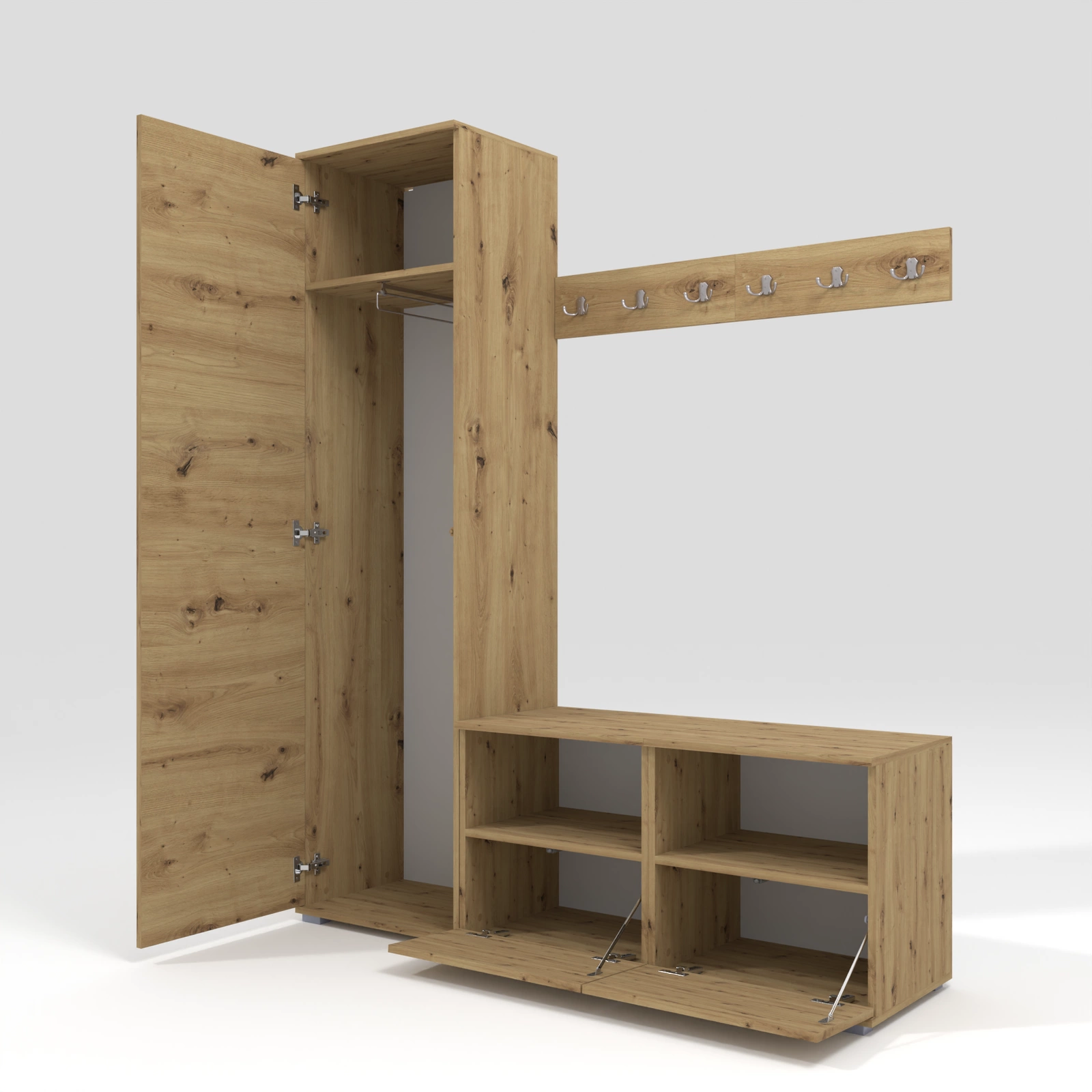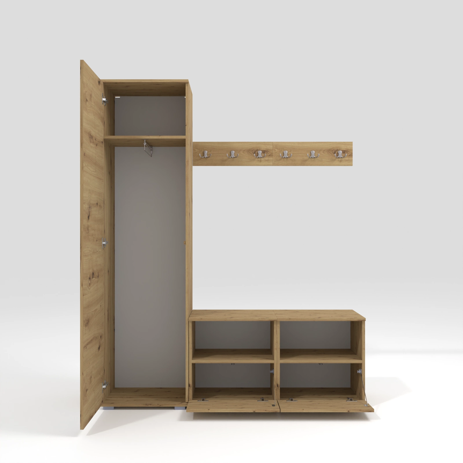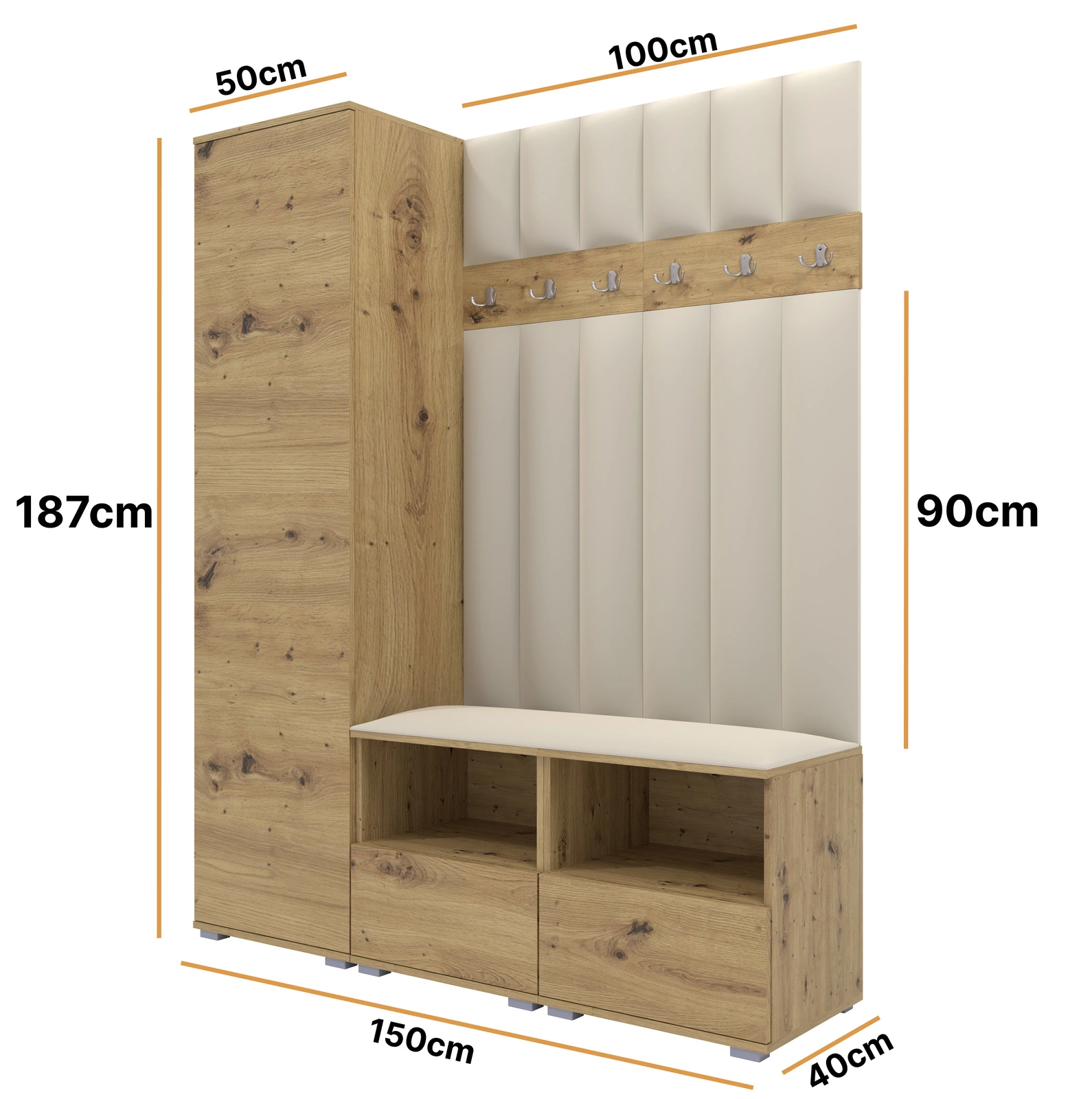 • Stylowa garderoba w kolorze dąb artisan z panelami tapicerowanymi w kolorze kremowym. Zawiera wysoką szafkę z wieszakiem, podwójne siedzisko z szafką na buty oraz wieszak z haczykami. Idealny wybór dla tych, którzy cenią sobie elegancję i praktyczność.