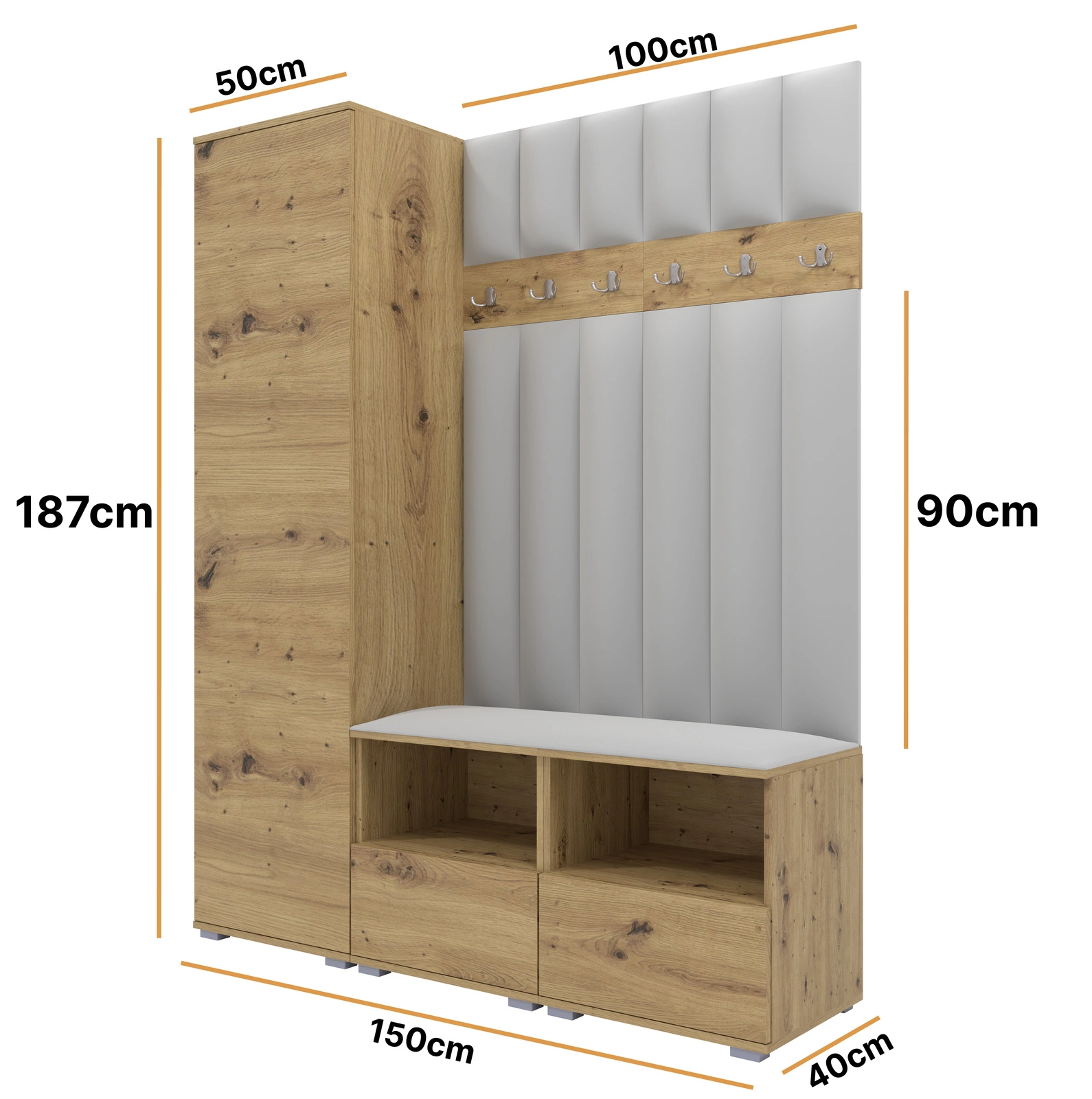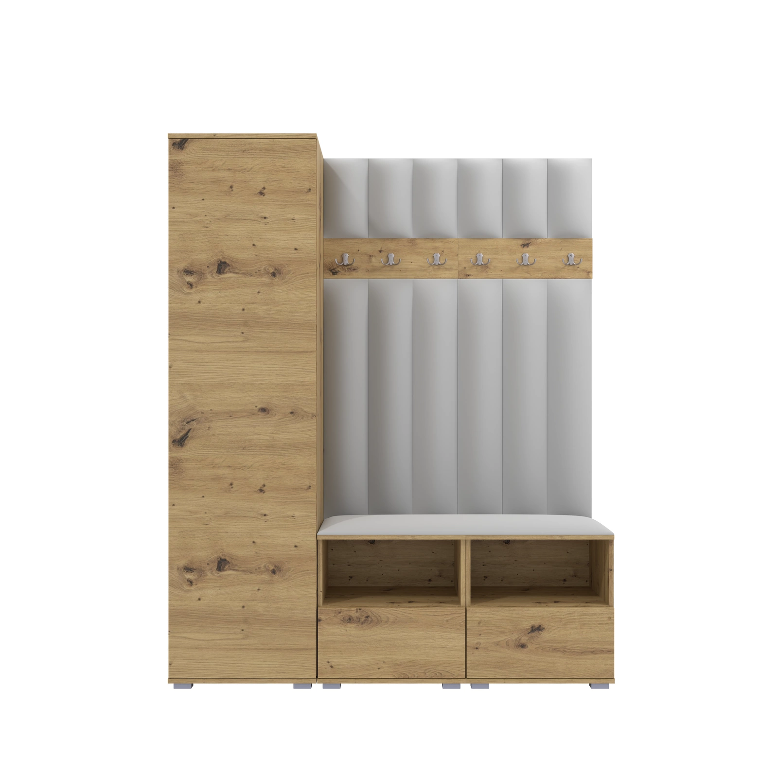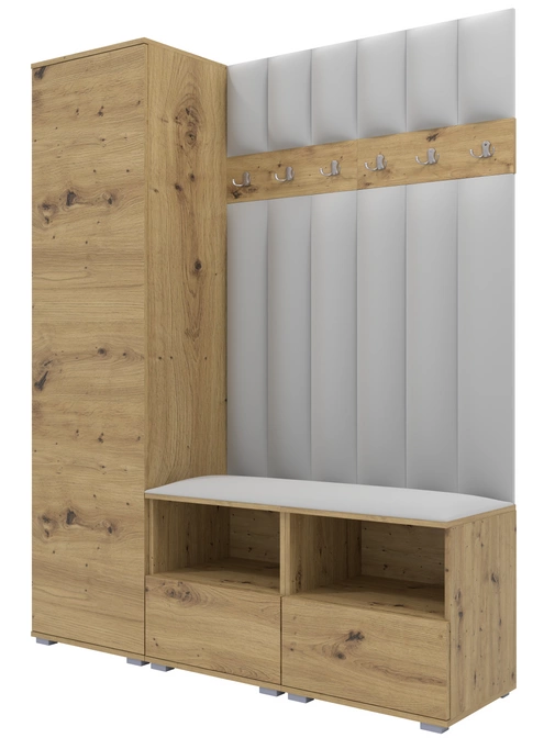 • Stylowa garderoba w kolorze dąb artisan z panelami tapicerowanymi w kolorze jasnoszarym. Zawiera wysoką szafkę z wieszakiem, podwójne siedzisko z szafką na buty oraz wieszak z haczykami. Idealny wybór dla tych, którzy cenią sobie elegancję i praktyczność.