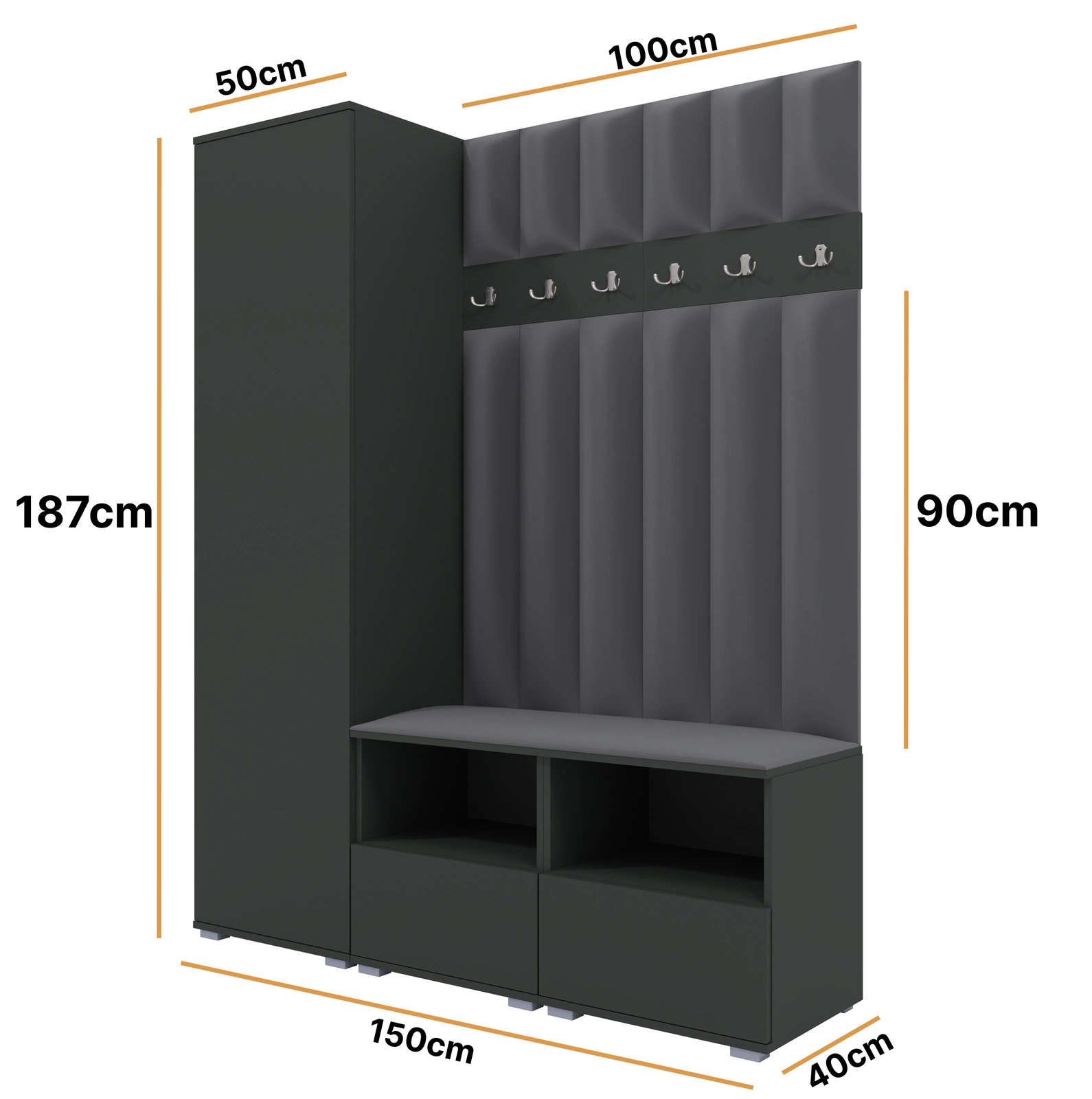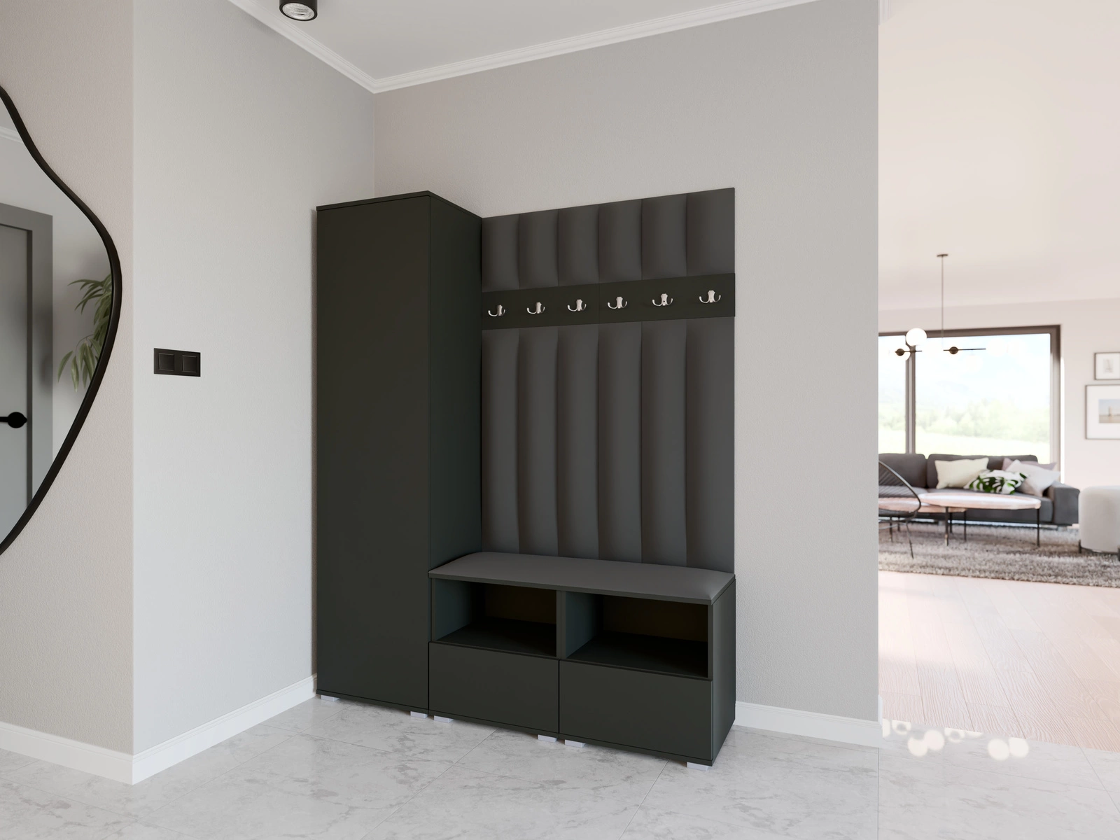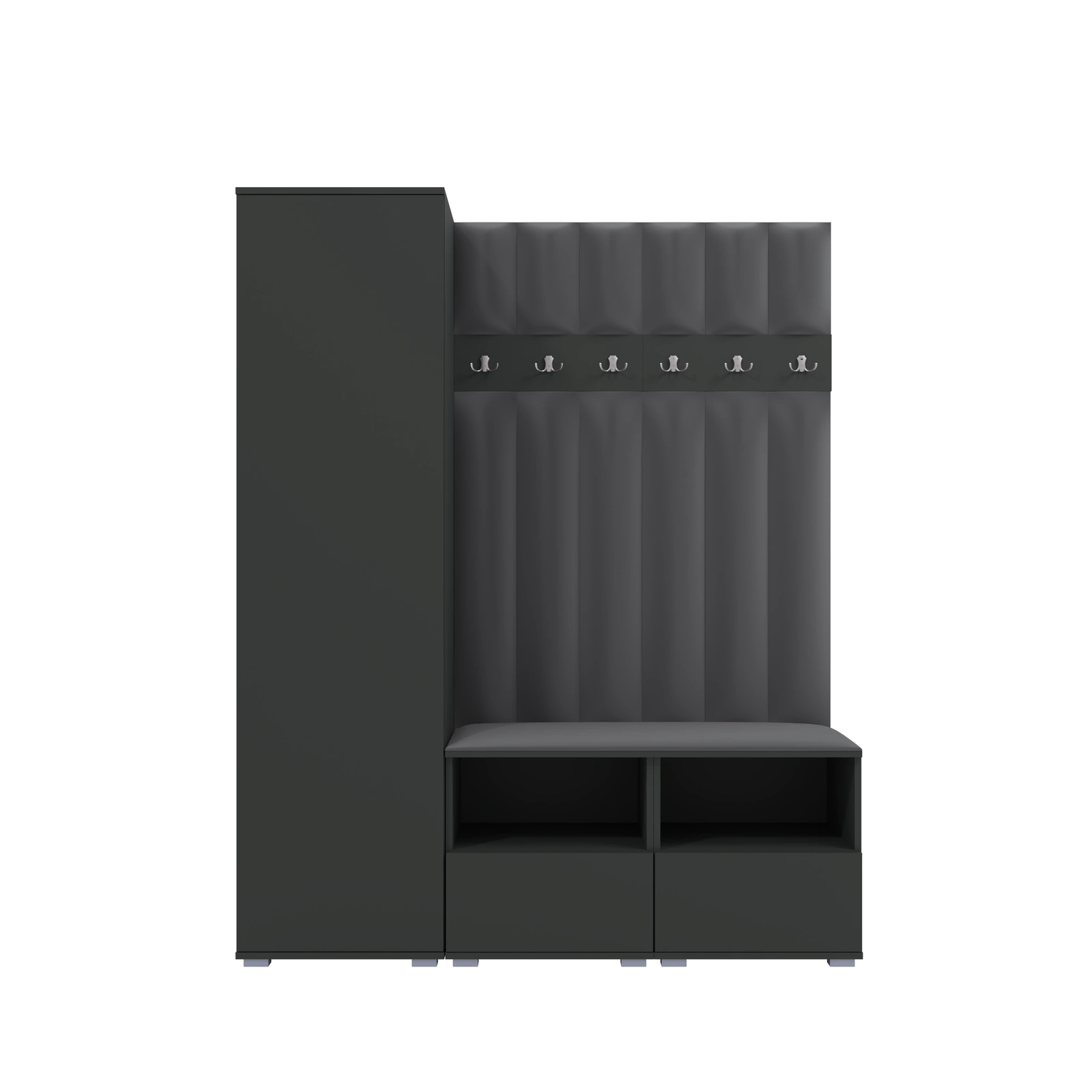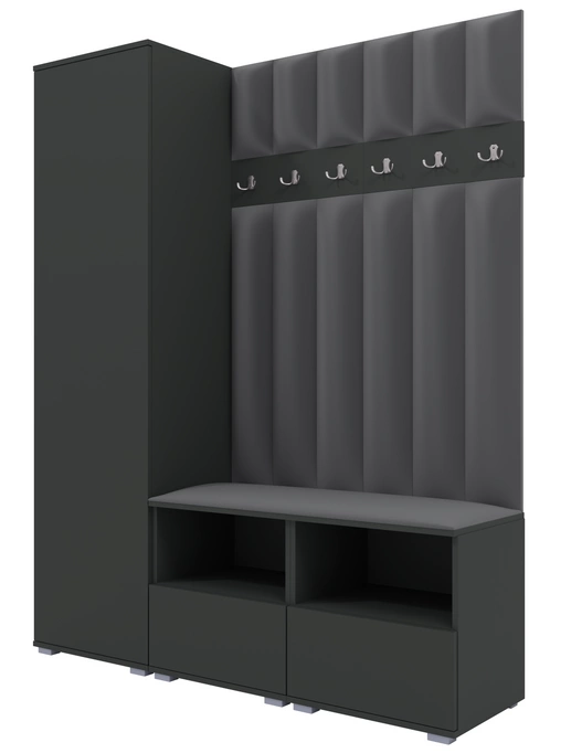 - Stylowa, grafit garderoba z panelami tapicerowanymi w ciemnoszarym kolorze. Zawiera wysoką szafkę z wieszakiem, podwójne siedzisko z szafką na buty oraz wieszak z haczykami. Idealny wybór dla tych, którzy cenią sobie elegancję i praktyczność.