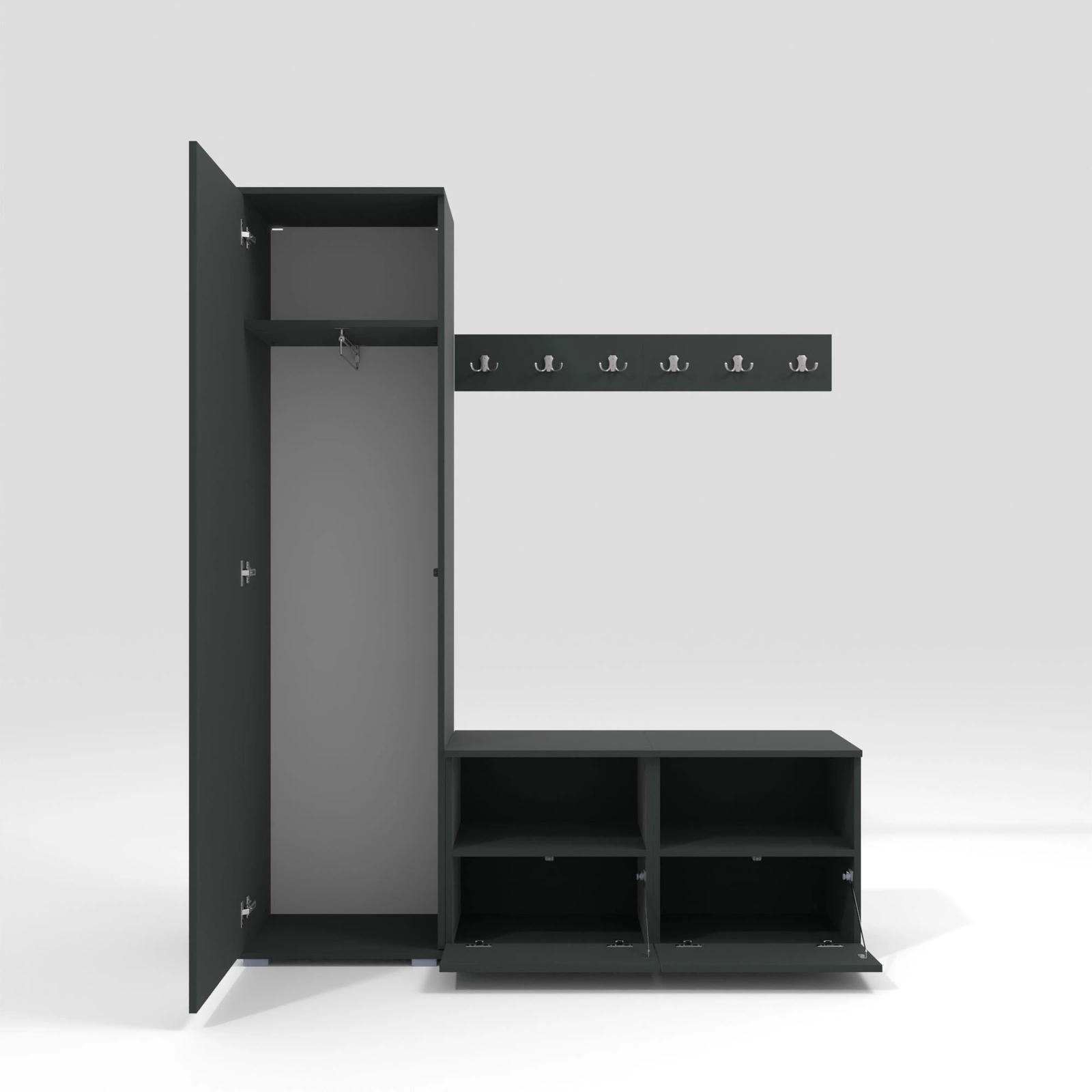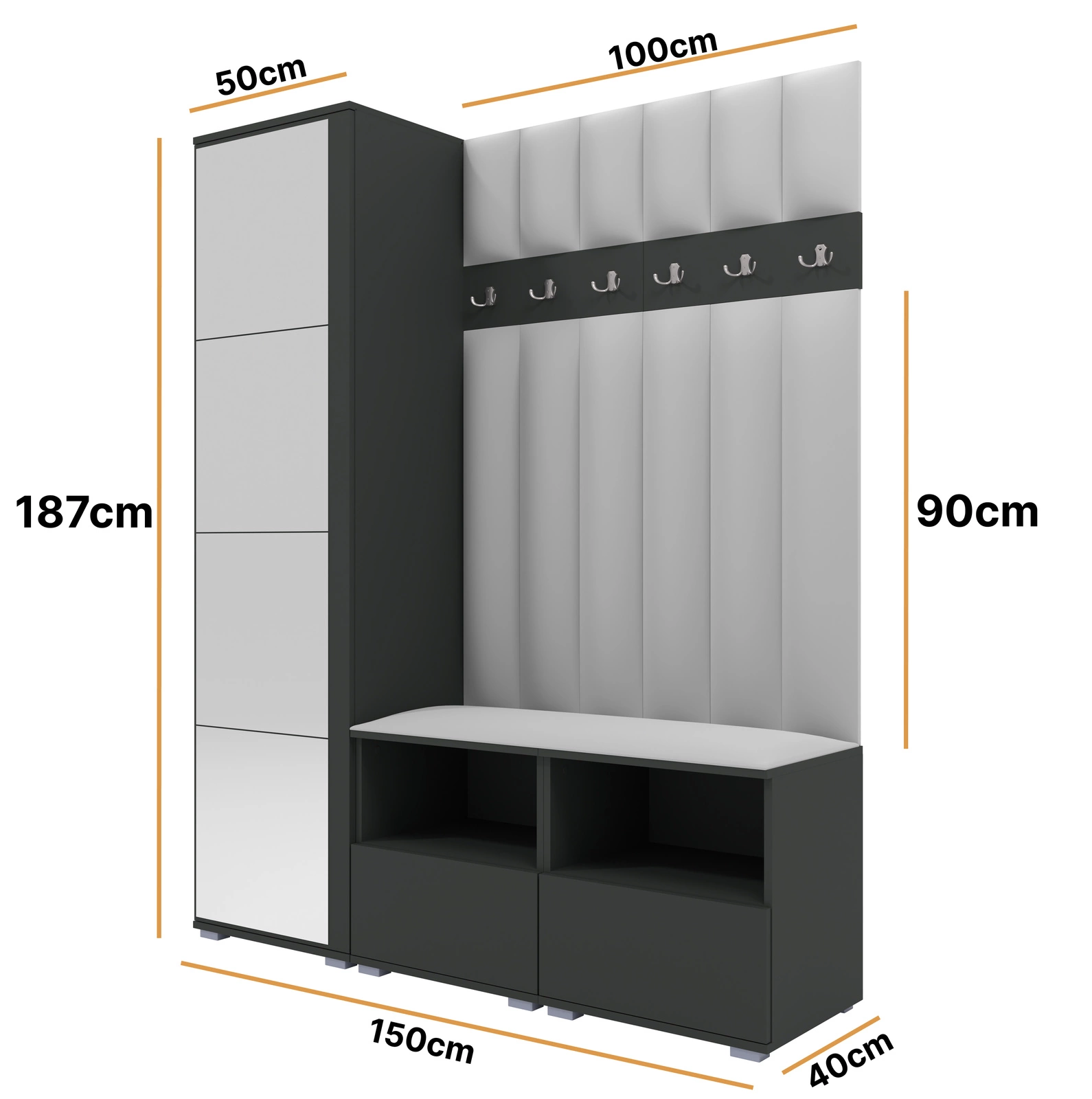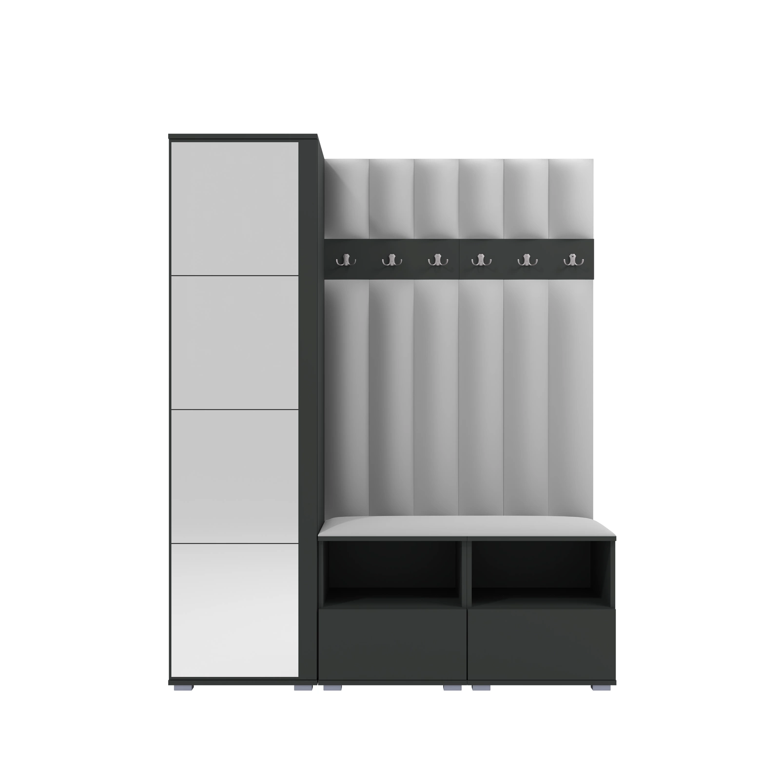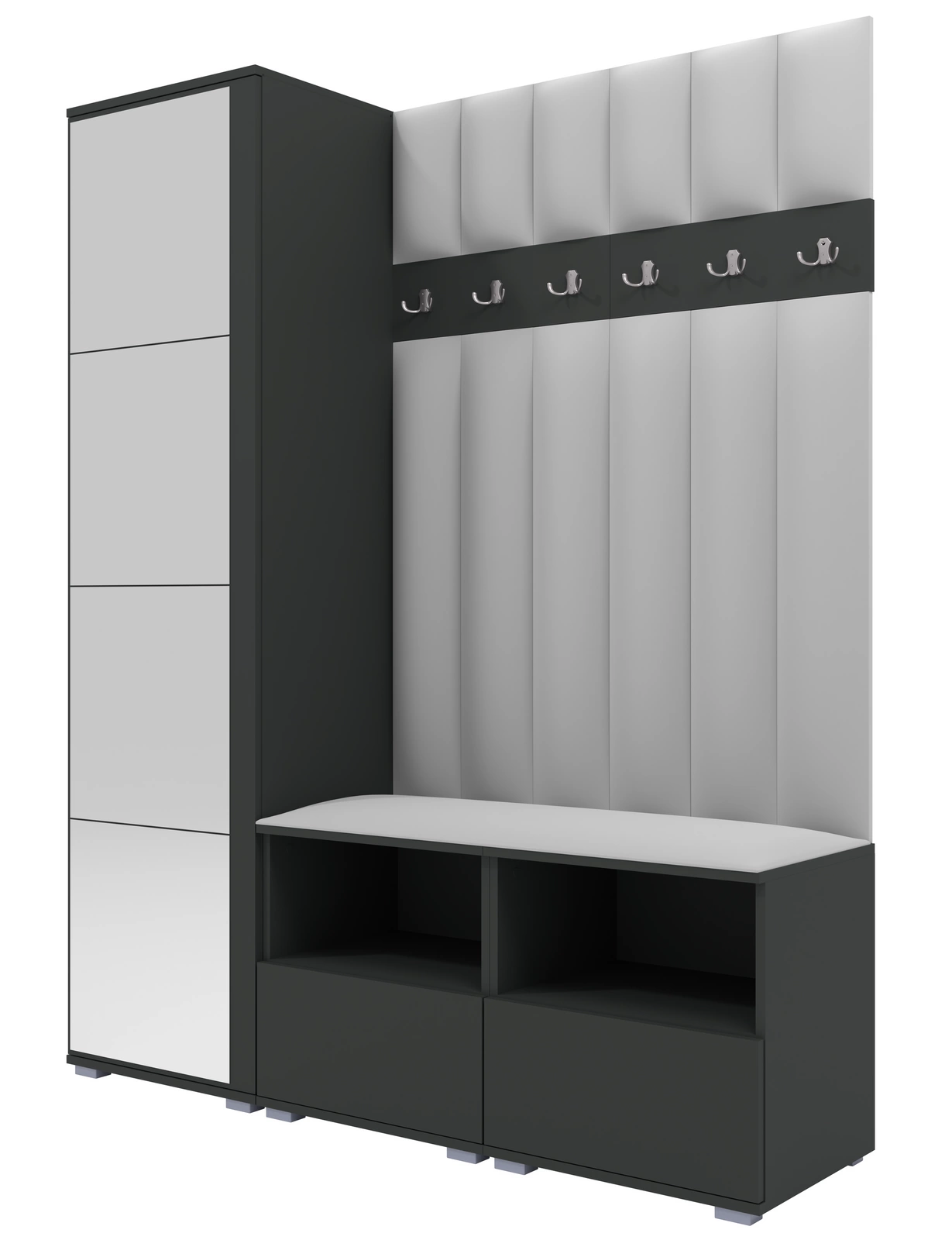 • Garderoba w kolorze grafit z lustrem i z panelami tapicerowanymi w kolorze jasnoszarym. Zawiera wysoką szafkę z wieszakiem, podwójne siedzisko z szafką na buty oraz wieszak z haczykami. Idealny wybór dla tych, którzy cenią sobie elegancję i praktyczność.