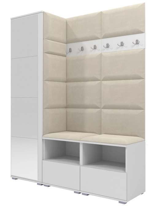 - Stylowa, biała garderoba z lustrem i z panelami tapicerowanymi w kremowym kolorze. Zawiera wysoką szafkę z wieszakiem, podwójne siedzisko z szafką na buty oraz wieszak z haczykami. Idealny wybór dla tych, którzy cenią sobie elegancję i praktyczność.