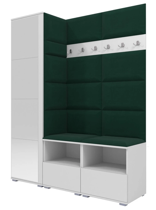 - Stylowa, biała garderoba z lustrem i z panelami tapicerowanymi w butelkowej zieleni. Zawiera wysoką szafkę z wieszakiem, podwójne siedzisko z szafką na buty oraz wieszak z haczykami. Idealny wybór dla tych, którzy cenią sobie elegancję i praktyczność.
