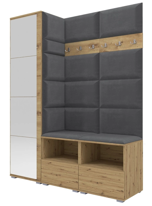 - Garderoba w kolorze dębu z lustrem i z panelami tapicerowanymi w kolorze ciemnoszarym. Zawiera wysoką szafkę z wieszakiem, podwójne siedzisko z szafką na buty oraz wieszak z haczykami. Idealny wybór dla tych, którzy cenią sobie elegancję i praktyczność
