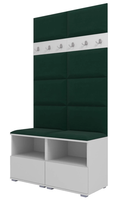 - Stylowa, biała garderoba z panelami tapicerowanymi w kolorze butelkowa zieleń. Zawiera podwójne siedzisko z szafką na buty oraz wieszak z haczykami. Idealny wybór dla tych, którzy cenią sobie kompaktową elegancję i praktyczność.