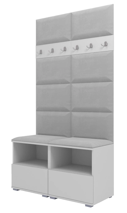 - Stylowa, biała garderoba z panelami tapicerowanymi w jasnoszarym kolorze. Zawiera podwójne siedzisko z szafką na buty oraz wieszak z haczykami. Idealny wybór dla tych, którzy cenią sobie kompaktową elegancję i praktyczność.