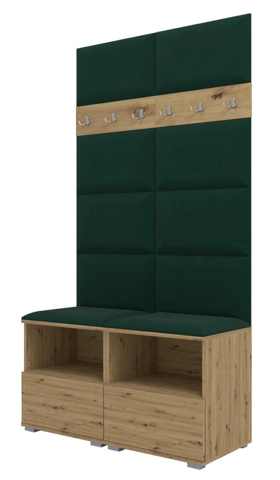 - Stylowa garderoba w kolorze dąb artisan z panelami tapicerowanymi w kolorze butelkowa zieleń. Zawiera podwójne siedzisko z szafką na buty oraz wieszak z haczykami. Idealny wybór dla tych, którzy cenią sobie kompaktową elegancję i praktyczność.