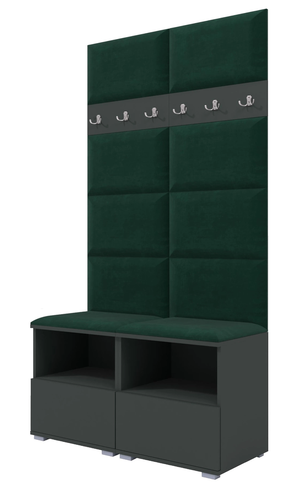 - Stylowa, grafitowa garderoba z panelami tapicerowanymi w kolorze butelkowa zieleń. Zawiera podwójne siedzisko z szafką na buty oraz wieszak z haczykami. Idealny wybór dla tych, którzy cenią sobie kompaktową elegancję i praktyczność.