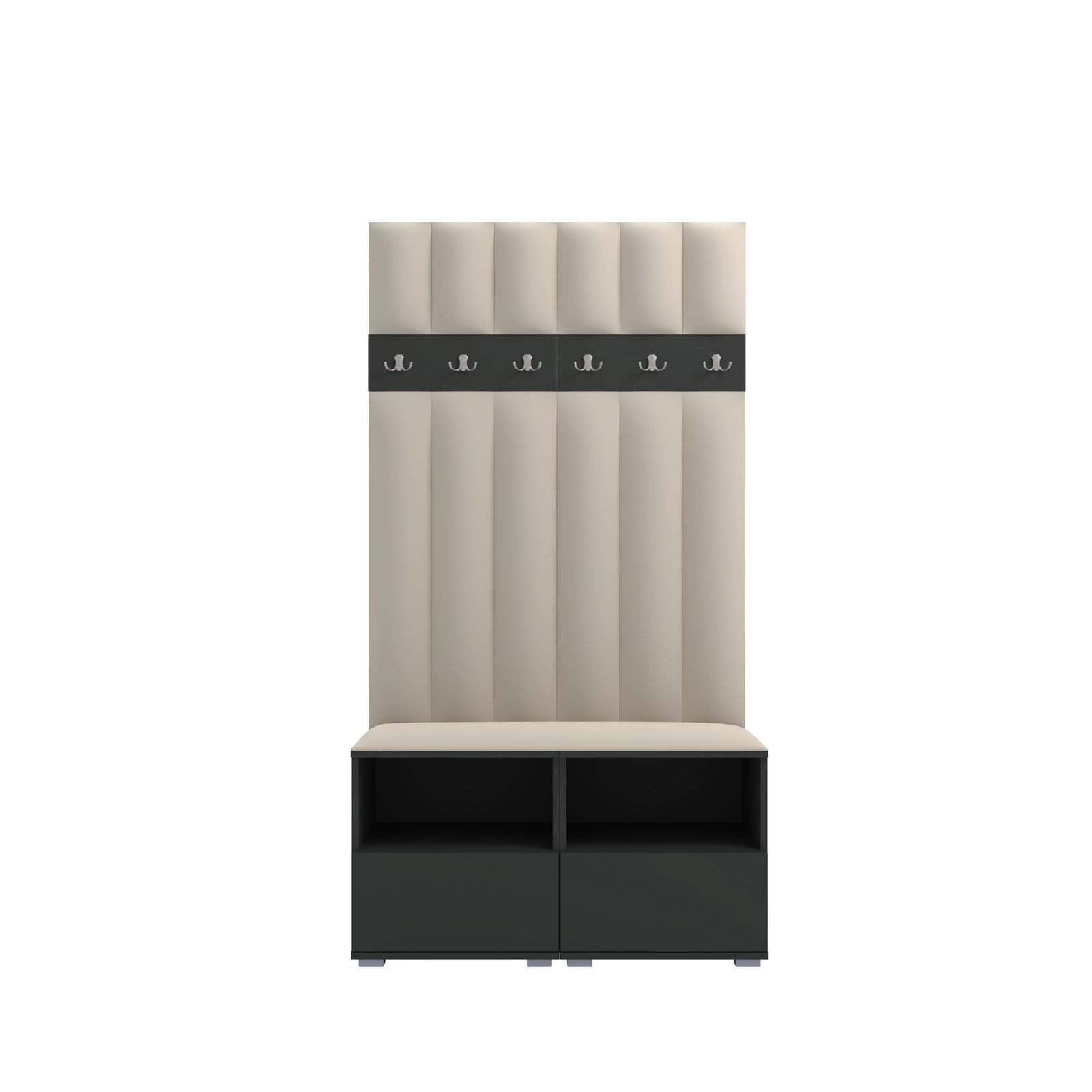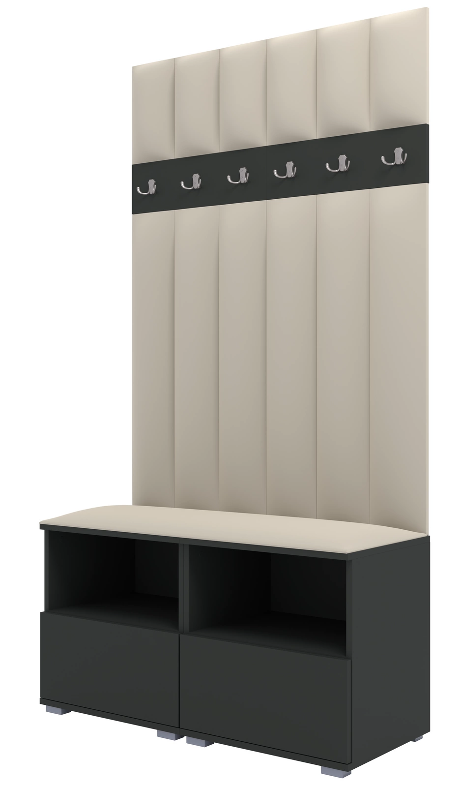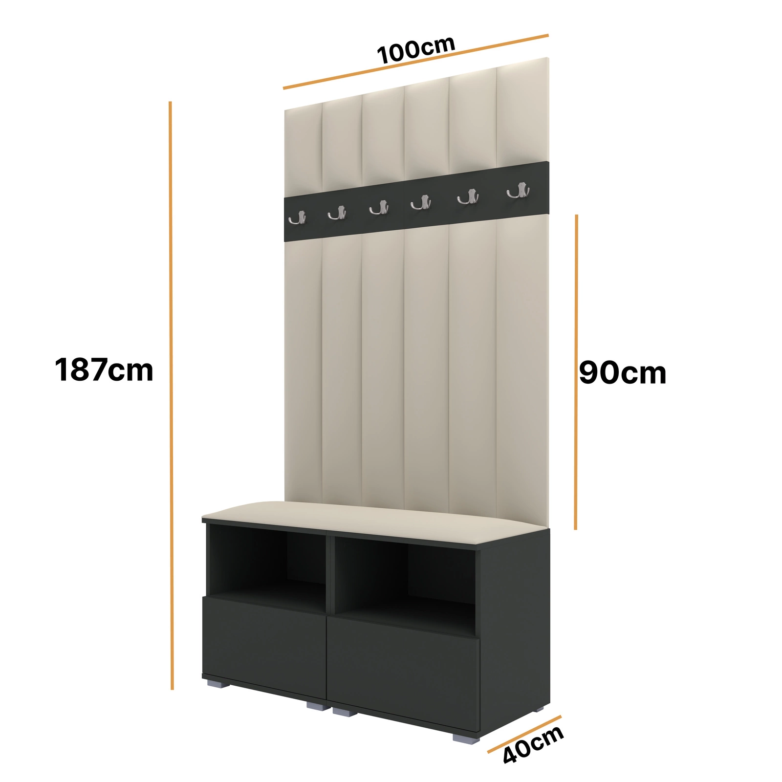 - Stylowa, grafitowa garderoba z panelami tapicerowanymi w kremowym kolorze. Zawiera podwójne siedzisko z szafką na buty oraz wieszak z haczykami. Idealny wybór dla tych, którzy cenią sobie kompaktową elegancję i praktyczność.