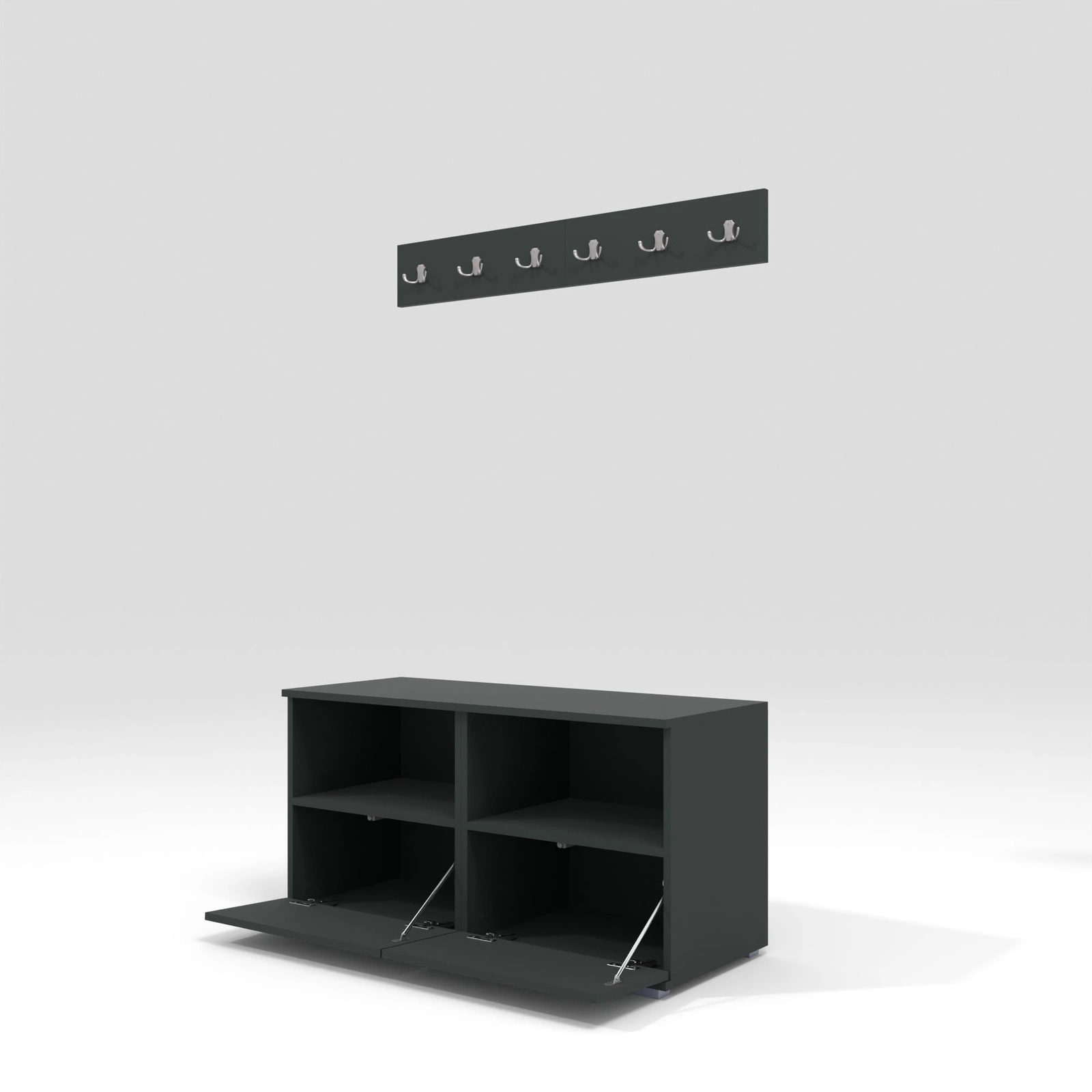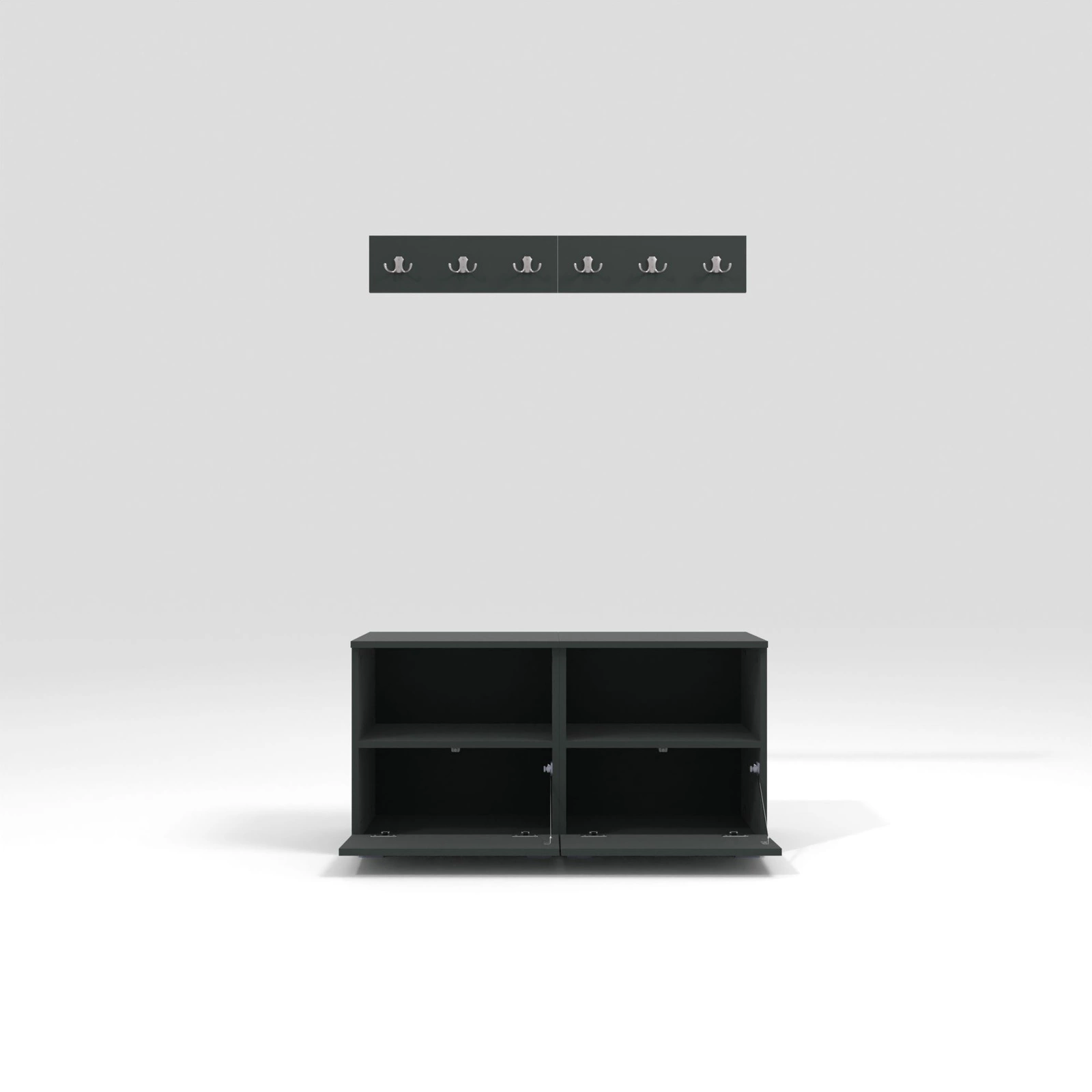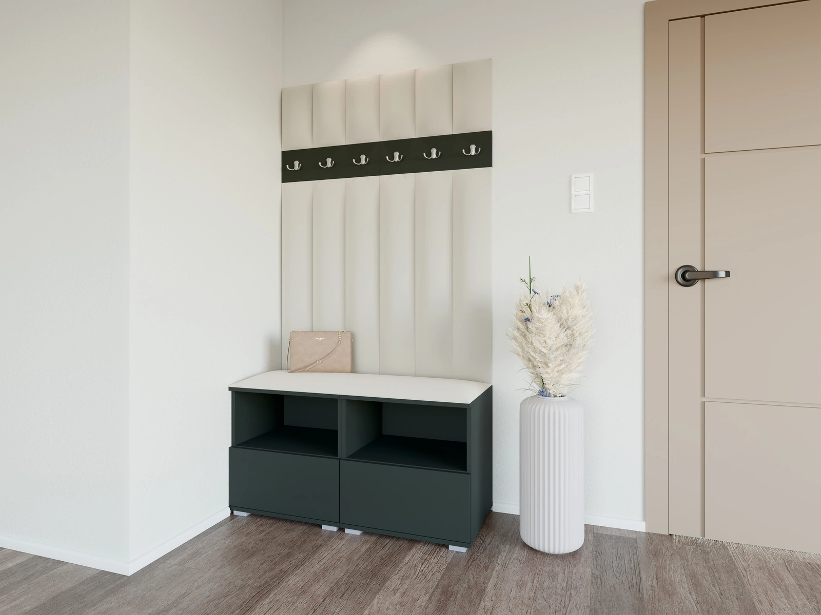 - Stylowa, grafitowa garderoba z panelami tapicerowanymi w kremowym kolorze. Zawiera podwójne siedzisko z szafką na buty oraz wieszak z haczykami. Idealny wybór dla tych, którzy cenią sobie kompaktową elegancję i praktyczność.