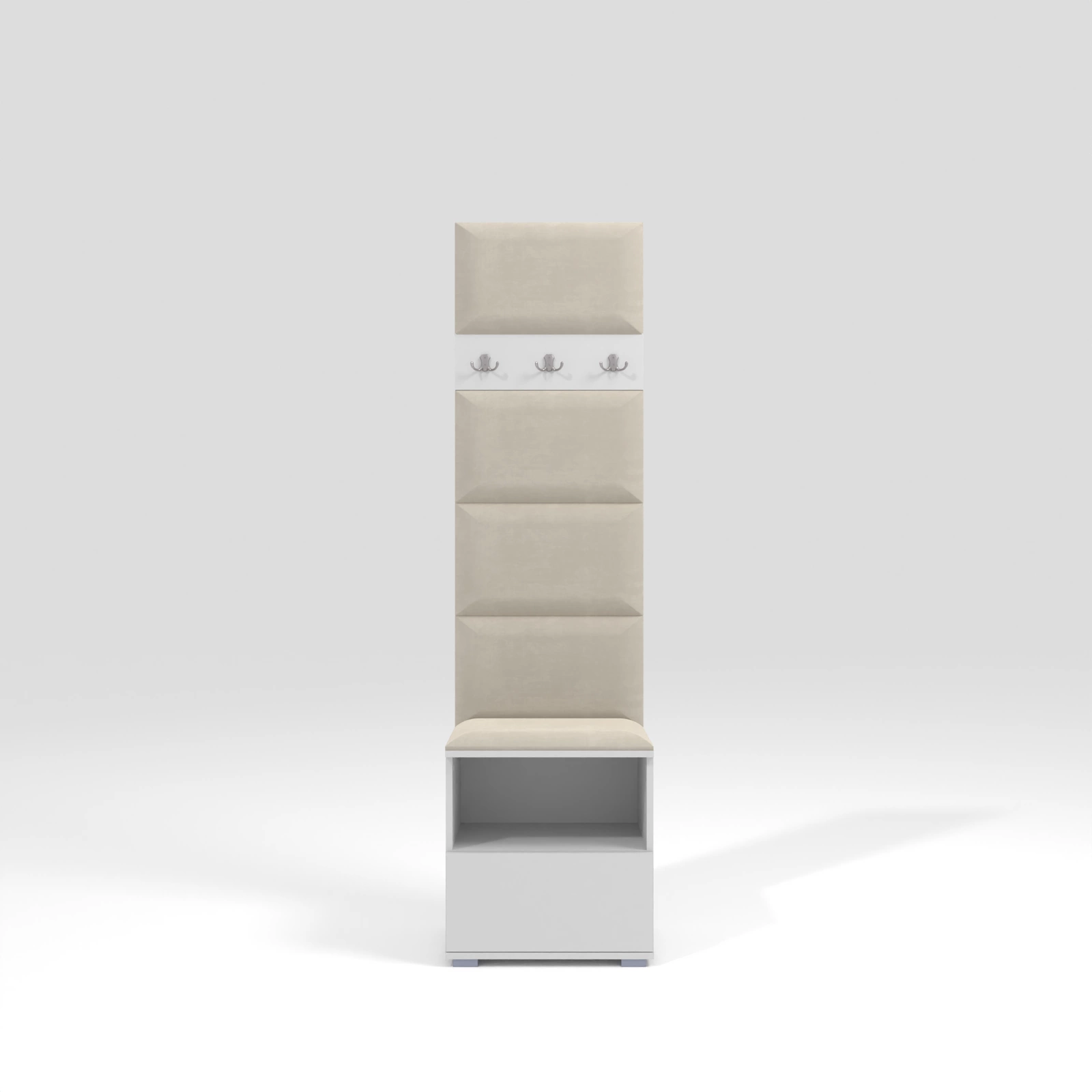 - Stylowa, biała garderoba z panelami tapicerowanymi w kolorze kremowym. Zawiera siedzisko z szafką na buty oraz wieszak z haczykami. Idealny wybór dla tych, którzy cenią sobie kompaktową elegancję i praktyczność.
