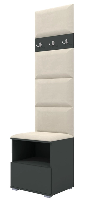 - Stylowa, grafitowa garderoba z panelami tapicerowanymi w kolorze kremowym. Zawiera siedzisko z szafką na buty oraz wieszak z haczykami. Idealny wybór dla tych, którzy cenią sobie kompaktową elegancję i praktyczność.