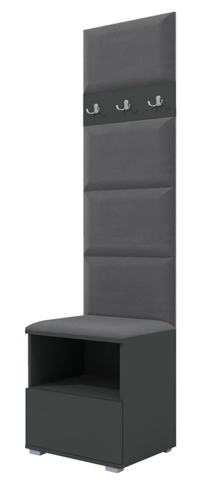 - Stylowa, grafitowa garderoba z panelami tapicerowanymi w kolorze grafitowym. Zawiera siedzisko z szafką na buty oraz wieszak z haczykami. Idealny wybór dla tych, którzy cenią sobie kompaktową elegancję i praktyczność.