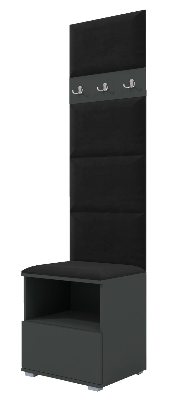 - Stylowa, grafitowa garderoba z panelami tapicerowanymi w kolorze czarnym. Zawiera siedzisko z szafką na buty oraz wieszak z haczykami. Idealny wybór dla tych, którzy cenią sobie kompaktową elegancję i praktyczność.