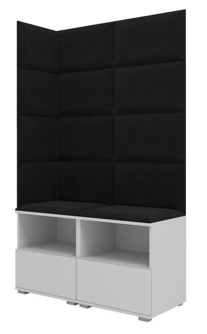 - Stylowa, biała garderoba z panelami tapicerowanymi w kolorze czarnym. Zawiera podwójne siedzisko z szafką na buty. Idealny wybór dla tych, którzy cenią sobie kompaktową elegancję i praktyczność.