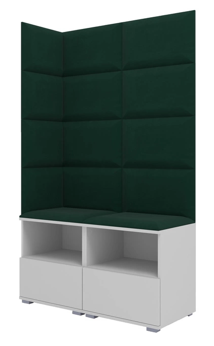 - Stylowa, biała garderoba z panelami tapicerowanymi w kolorze butelkowa zieleń. Zawiera podwójne siedzisko z szafką na buty. Idealny wybór dla tych, którzy cenią sobie kompaktową elegancję i praktyczność.