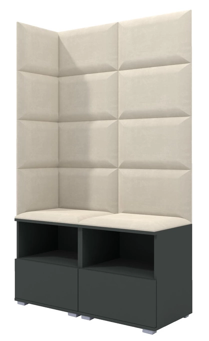 - Stylowa garderoba w kolorze grafitowym z panelami tapicerowanymi w kolorze kremowym. Zawiera podwójne siedzisko z szafką na buty. Idealny wybór dla tych, którzy cenią sobie kompaktową elegancję i praktyczność.