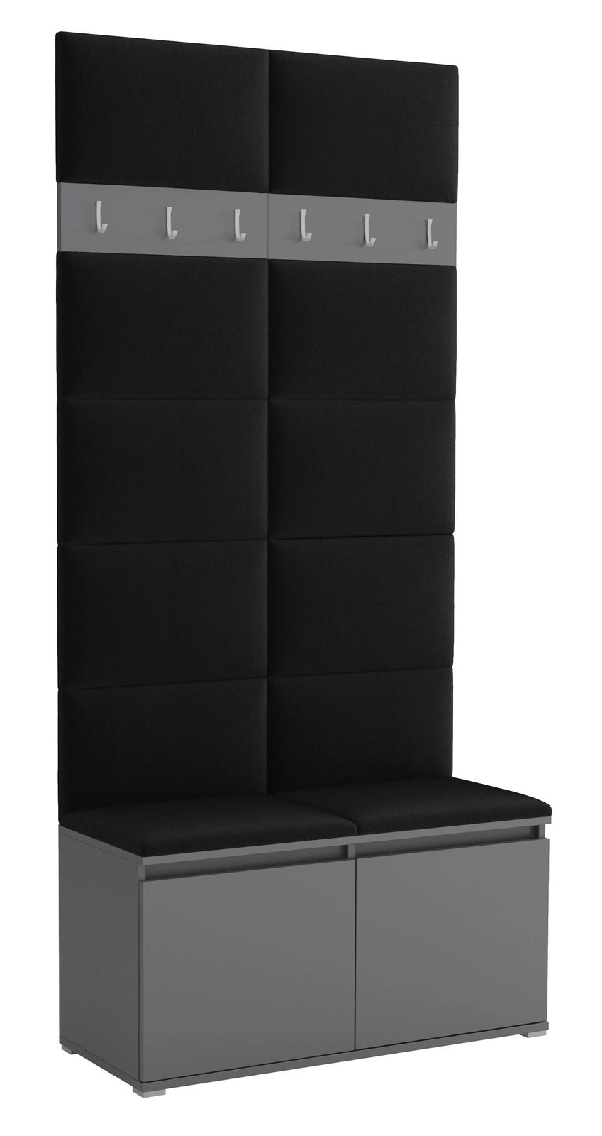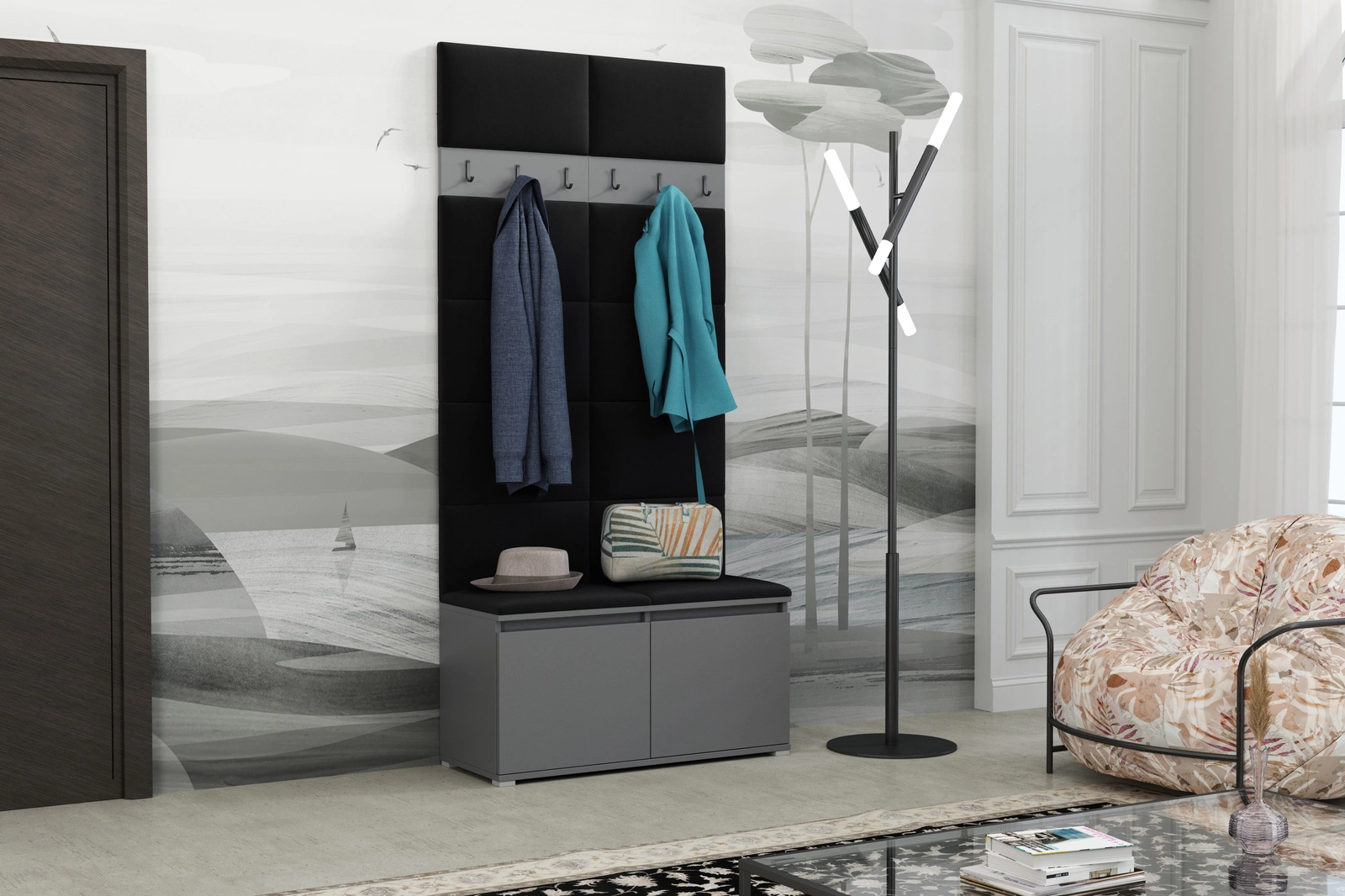 • Stylowa garderoba tapicerowana z miękkich paneli, z rzędem solidnych wieszaków oraz miejscem na obuwie. Chroni ścianę, porządkuje płaszcze i kurtki, ociepla przestrzeń, a przy tym montaż jest szybki, a design pasuje do nowoczesnych i klasycznych wnętrz.