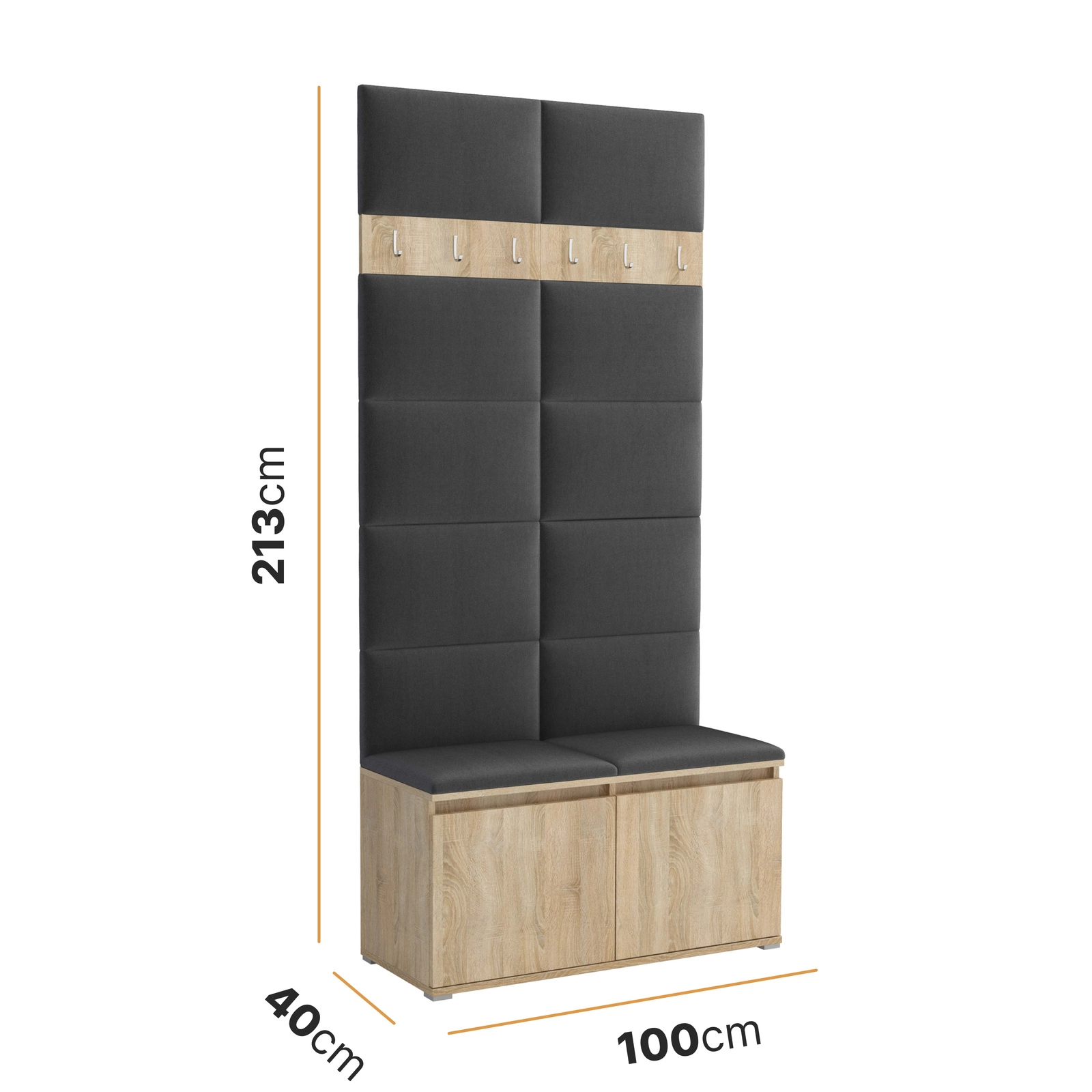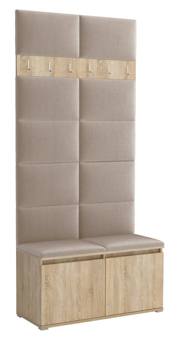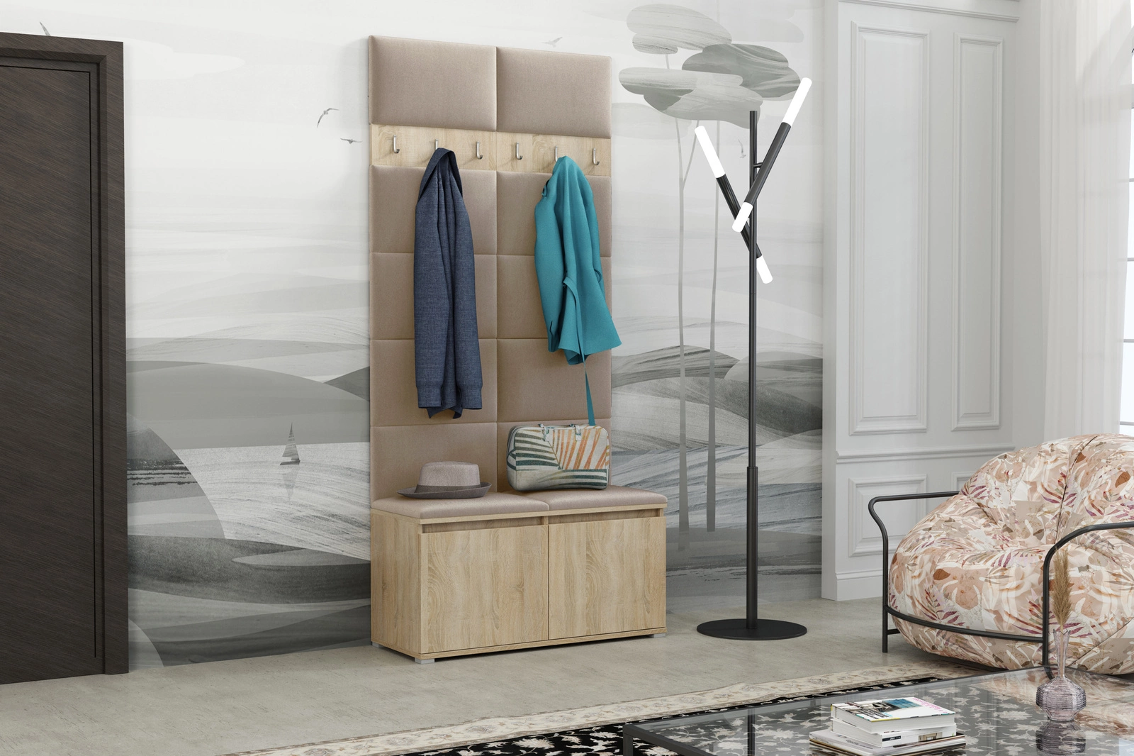 - Stylowa garderoba tapicerowana z miękkich paneli, z rzędem solidnych wieszaków oraz miejscem na obuwie. Chroni ścianę, porządkuje płaszcze i kurtki, ociepla przestrzeń, a przy tym montaż jest szybki, a design pasuje do nowoczesnych i klasycznych wnętrz.